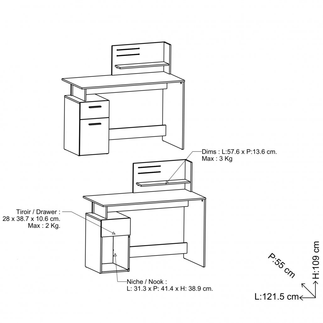 - Namizna enota je opremljena z eno polico ter dvema elastičnima trakovoma za držanje zapiskov, fotografij ali podobnih stvari