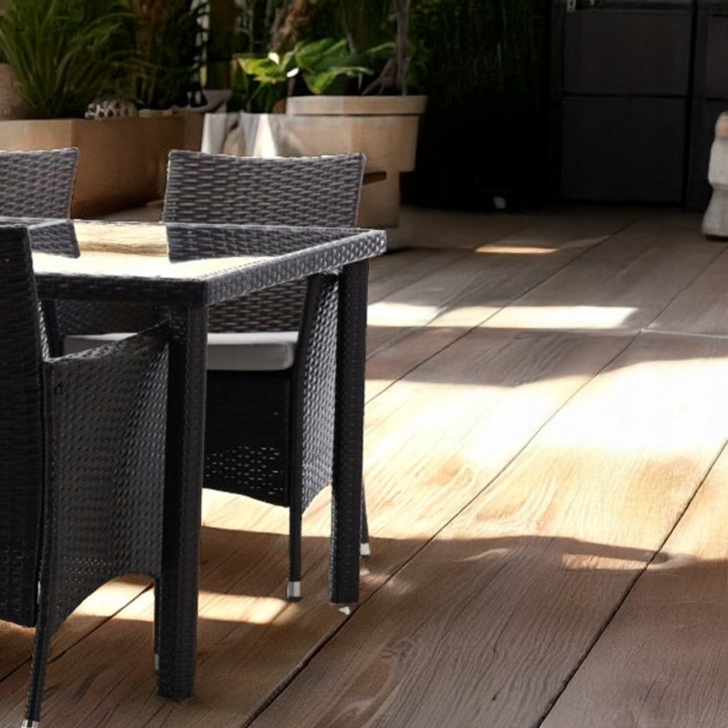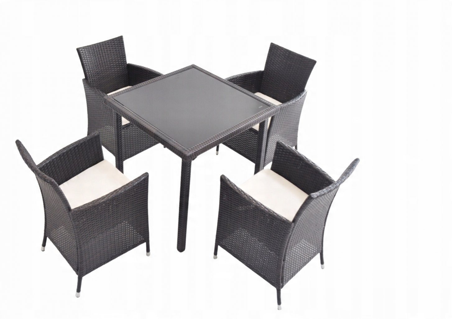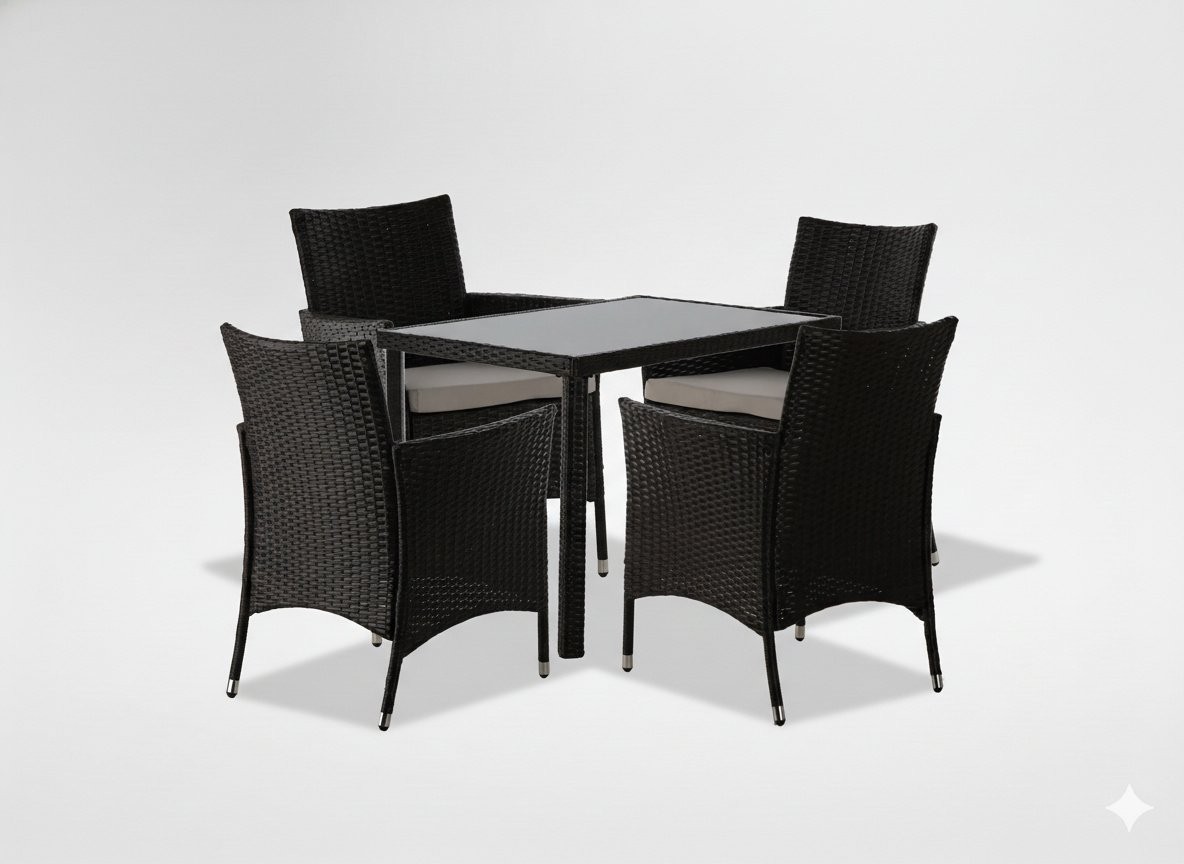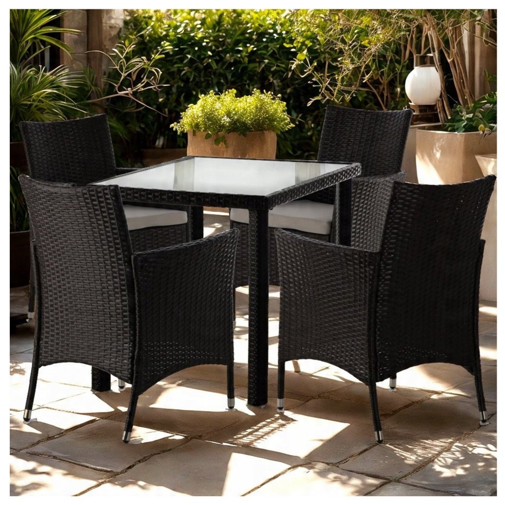 Ratanasti vrtni set Pano z mizo in 4 stoli (rjav/bež) je eleganten komplet za vrt, teraso, balkon ali zimski vrt. Rjava barva pohištva in bež blazine ustvarijo prijetno kombinacijo, sintetični ratan pa je v opisu naveden kot odporen na UV-sevanje in vlago.