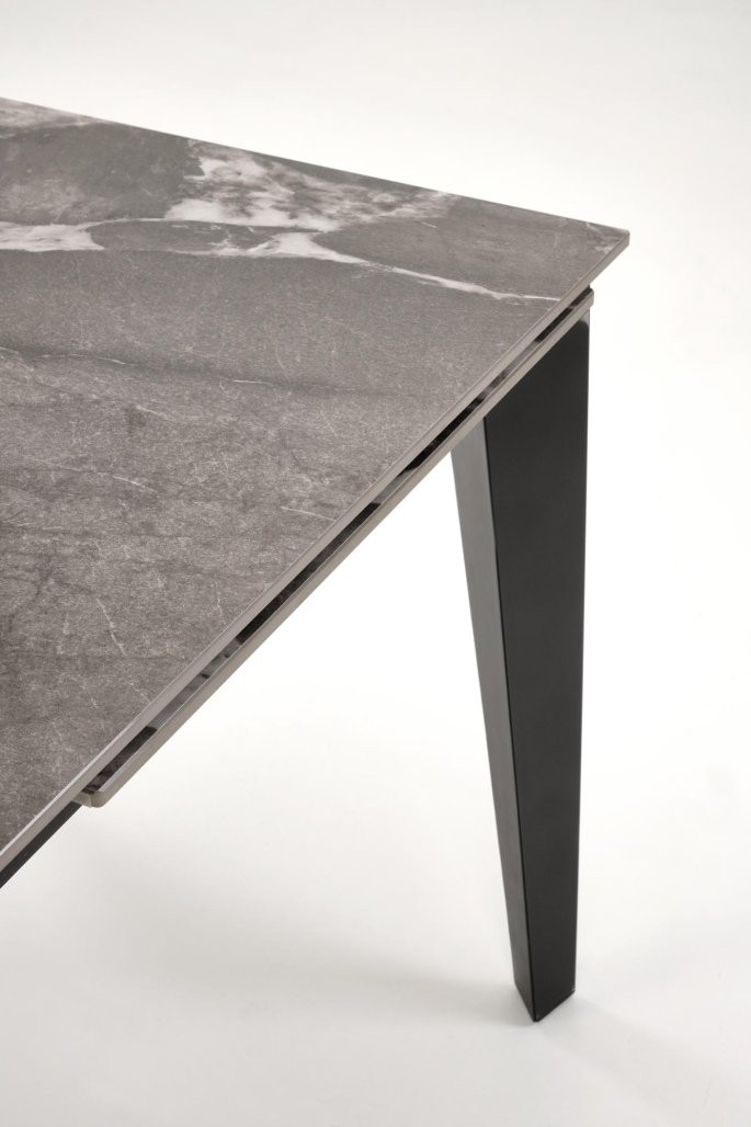 Raztegljiva jedilna miza Alerin v modernem slogu z marmorno površino sive barve in črnim kovinskim ogrodjem. Praktična izbira za večje jedilnice, prilagodljiva velikosti.