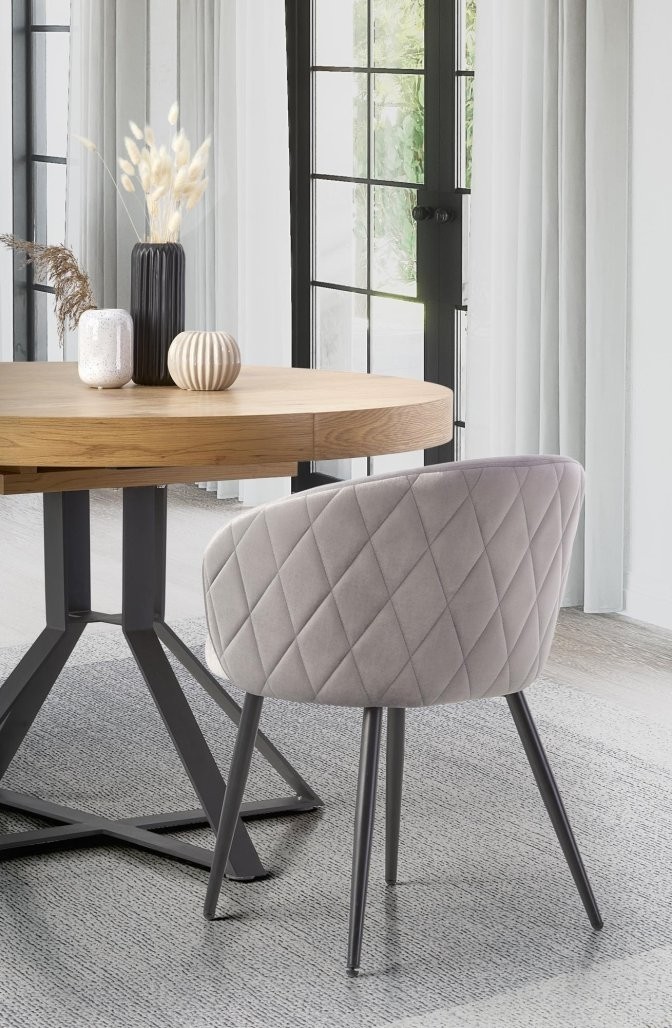Raztegljiva jedilna miza Alor z zlato hrast ploščo in črnimi kovinskimi nogami. Z raztegljivo funkcijo omogoča enostavno preklapljanje za večje število gostov.