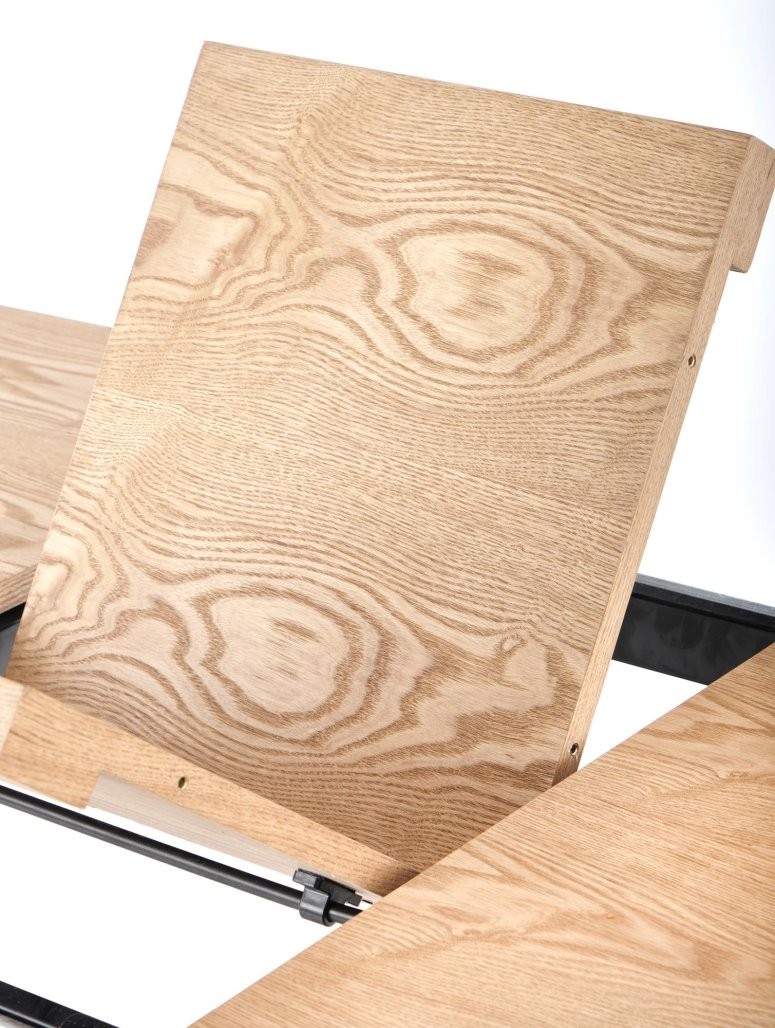 Raztegljiva jedilna miza Anlen omogoča podaljšanje dolžine od 160 do 200 cm. Površina iz naravnega hrasta in črne kovinske noge ustvarjajo eleganten industrijski videz.