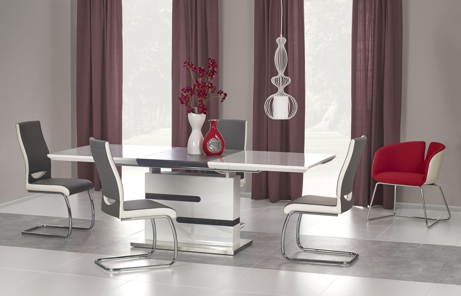 Raztegljiva jedilna miza Asir iz lakiranega MDF in nerjavečega jekla v beli in sivi barvi. Sodoben in prestižen dizajn, primeren za šest do osem oseb, s prilagodljivo dolžino.