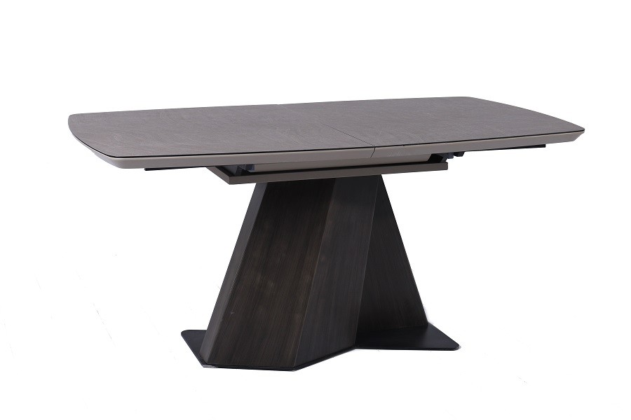Raztegljiva jedilna miza AZALEA ima keramično ploščo v melanin barvi. Rob plošče v cappuccino mat barvi. Podnožje in steber sta obdelana z grobim prašnim lakiranjem v črni barvi.