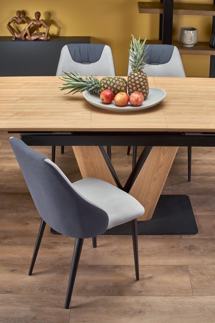 Raztegljiva jedilna miza Filar s podaljškom, ki omogoča dolžino od 160 do 200 cm. Površina iz naravnega hrasta in lakiranega MDF-ja, noge v naravnem ali črnem odtenku.