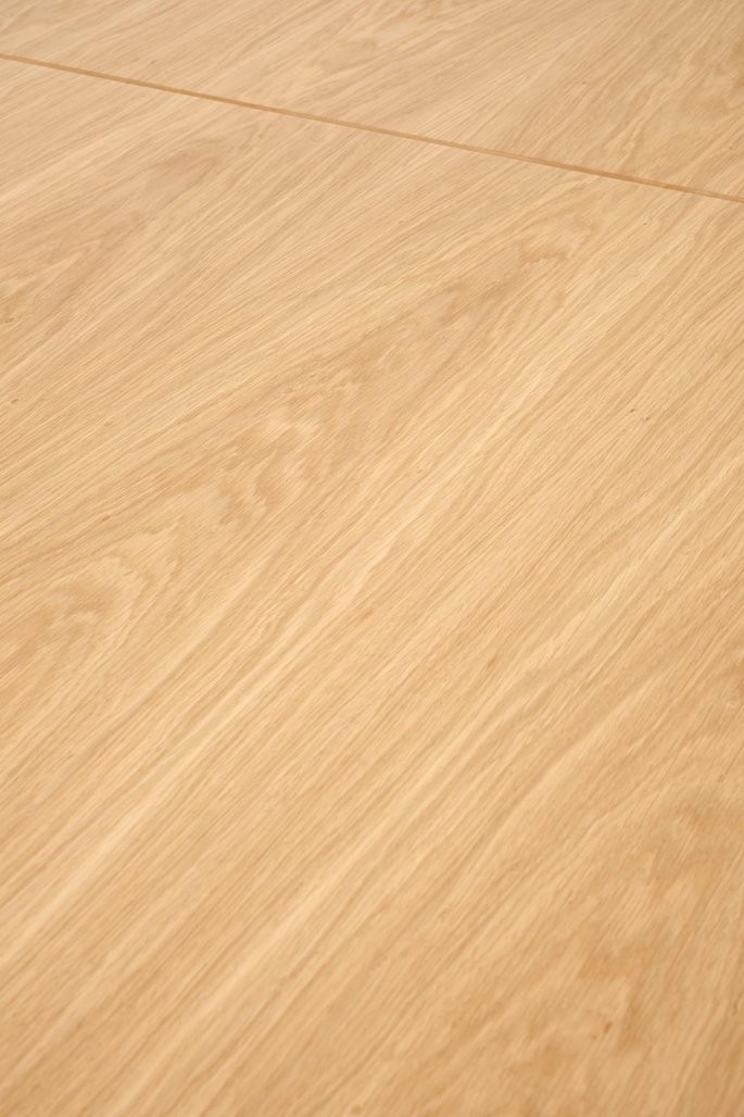 Plošča mize je izdelana iz furnirane plošče z robustnimi robovi iz masivnega lesa, ki zagotavlja toplino naravnega hrasta in dolgotrajno vzdržljivost. Noge iz prašno barvanega jekla v črni barvi dopolnjujejo industrijski slog in zagotavljajo izjemno stabilnost. Oljena površina mize je odporna na vlago in toploto, kar olajša čiščenje in ohranja naraven videz lesa skozi čas.