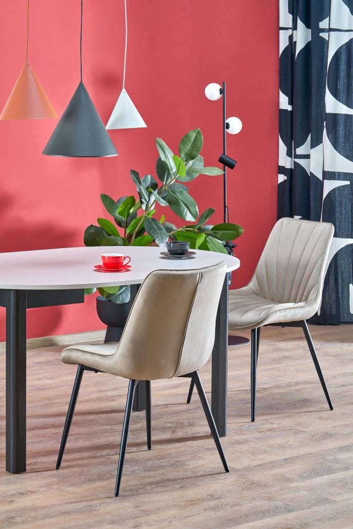 Izdelana je iz visokokakovostnih materialov, kot sta laminirana iverna plošča in laminiran MDF, ki zagotavljata trpežnost in dolgotrajno uporabo. Eleganten videz dopolnjuje privlačna barvna kombinacija, kjer se kašmir pult harmonično združuje s črnimi nogami. Ta miza se bo odlično podala k različnim stilom notranje opreme, od klasičnega do modernega.
