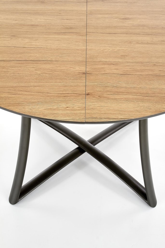 Raztegljiva jedilna miza Gorl iz laminiranega MDF in jekla z zlatimi hrastovimi detajli. Okrogla oblika s podaljški za pet do osem oseb, idealna za sodobne jedilnice.