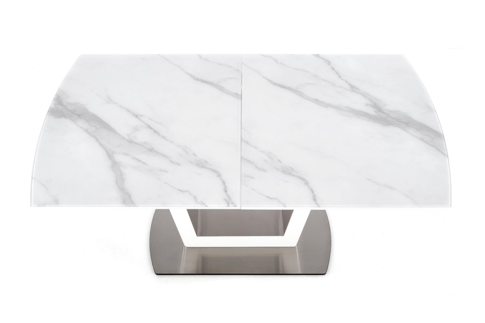 Raztegljiva jedilna miza Ilan s stekleno ploščo in belim marmornim zaključkom prinaša prestižan videz. Prilagodljiva dolžina omogoča uporabo za 6 do 8 oseb, idealna za svečane večerje.