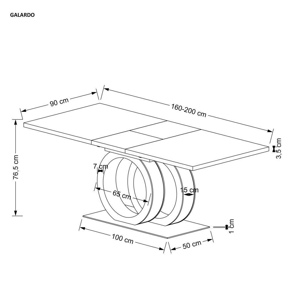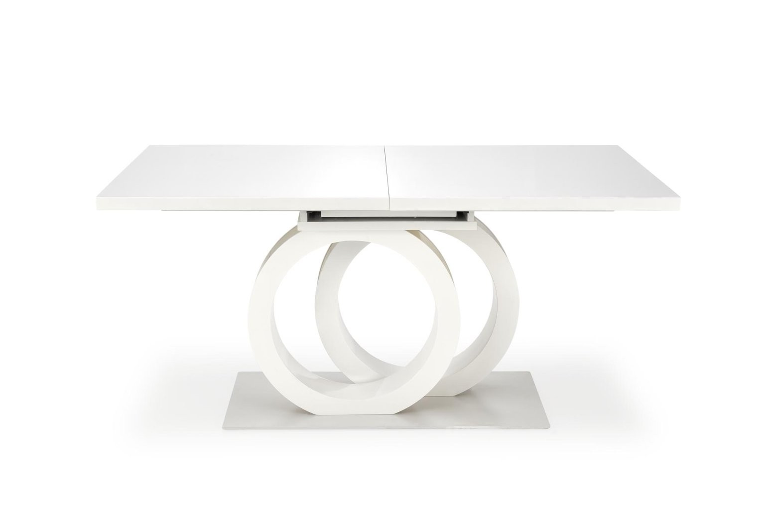 Raztegljiva jedilna miza Inarin s površino iz lakiranega MDF in okvirjem iz nerjavečega jekla ponuja prestižan videz v beli in zlati barvi. Prilagodljiva za 6 do 8 oseb, odlična za druženja.