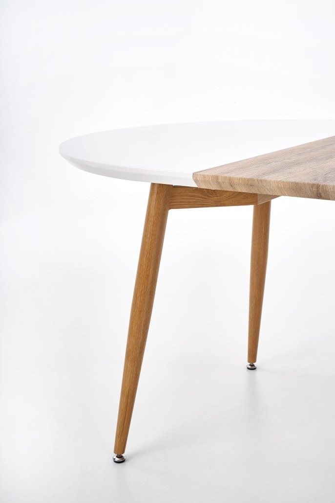 Raztegljiva jedilna miza Iram v skandinavskem slogu, izdelana iz lakiranega in laminiranega MDF ter pobarvanega jekla. Na voljo v več barvah, prilagodljiva dolžina od 120 do 200 cm, primerna za 4-8 oseb, ovalna ali okrogla plošča.