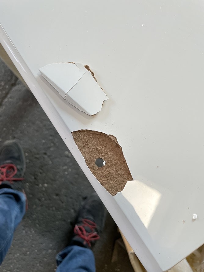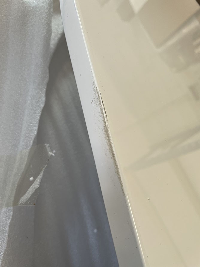 Miza je nova, nerabljena a ima nekaj odrgnin na plošči mize in poškodbo na nogi - glej slike.