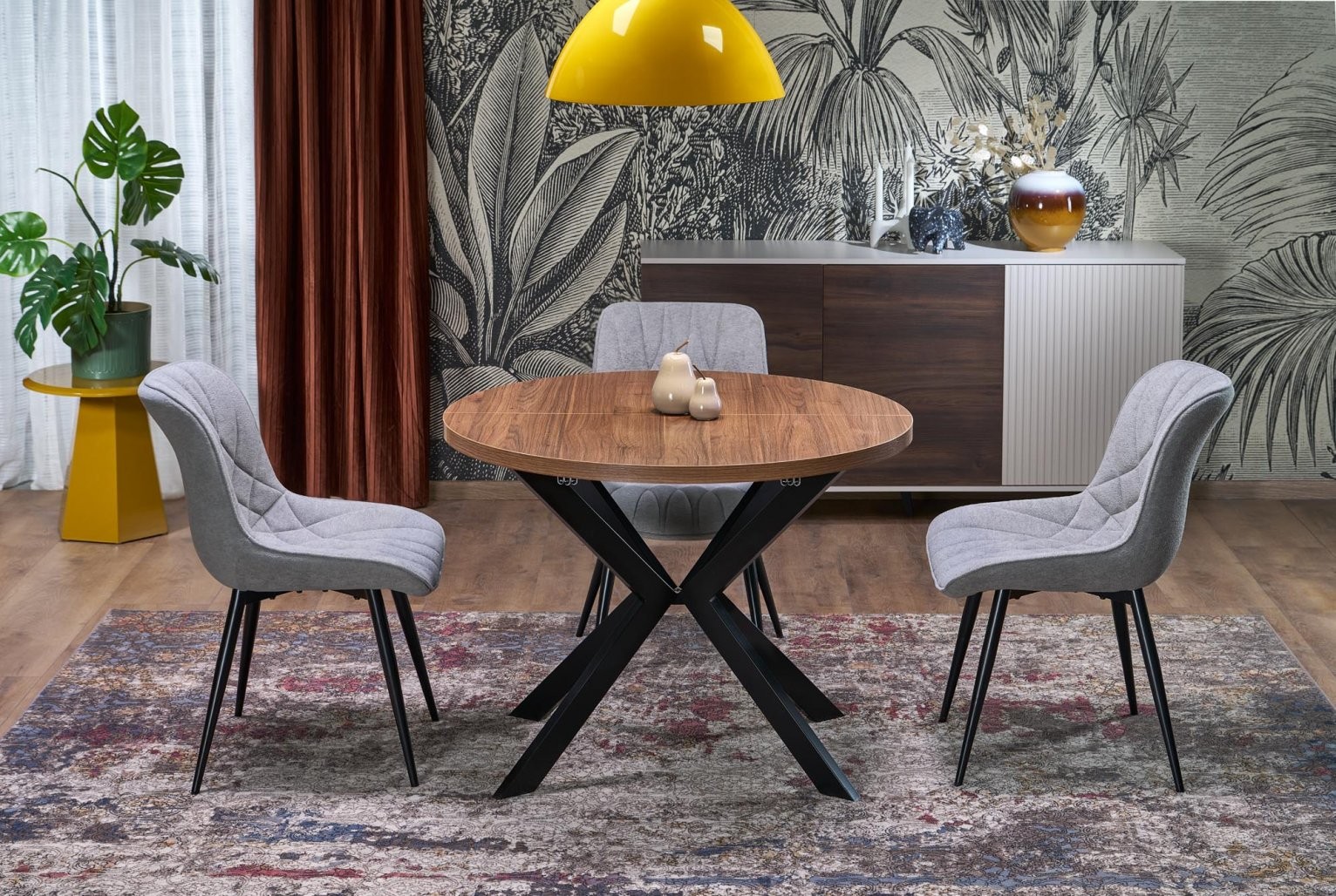 Izdelana je iz kombinacije laminirane iverne plošče in prašno lakiranega jekla, kar zagotavlja trpežnost in dolgotrajno uporabo. Jekleni elementi dodajo moderen videz in stabilnost. Miza je enostavna za vzdrževanje, kar je idealno za vsakodnevno uporabo in ohranjanje njene estetske privlačnosti. Barvna kombinacija oreha in črne prinaša toplino in prefinjenost v vaš jedilni prostor.