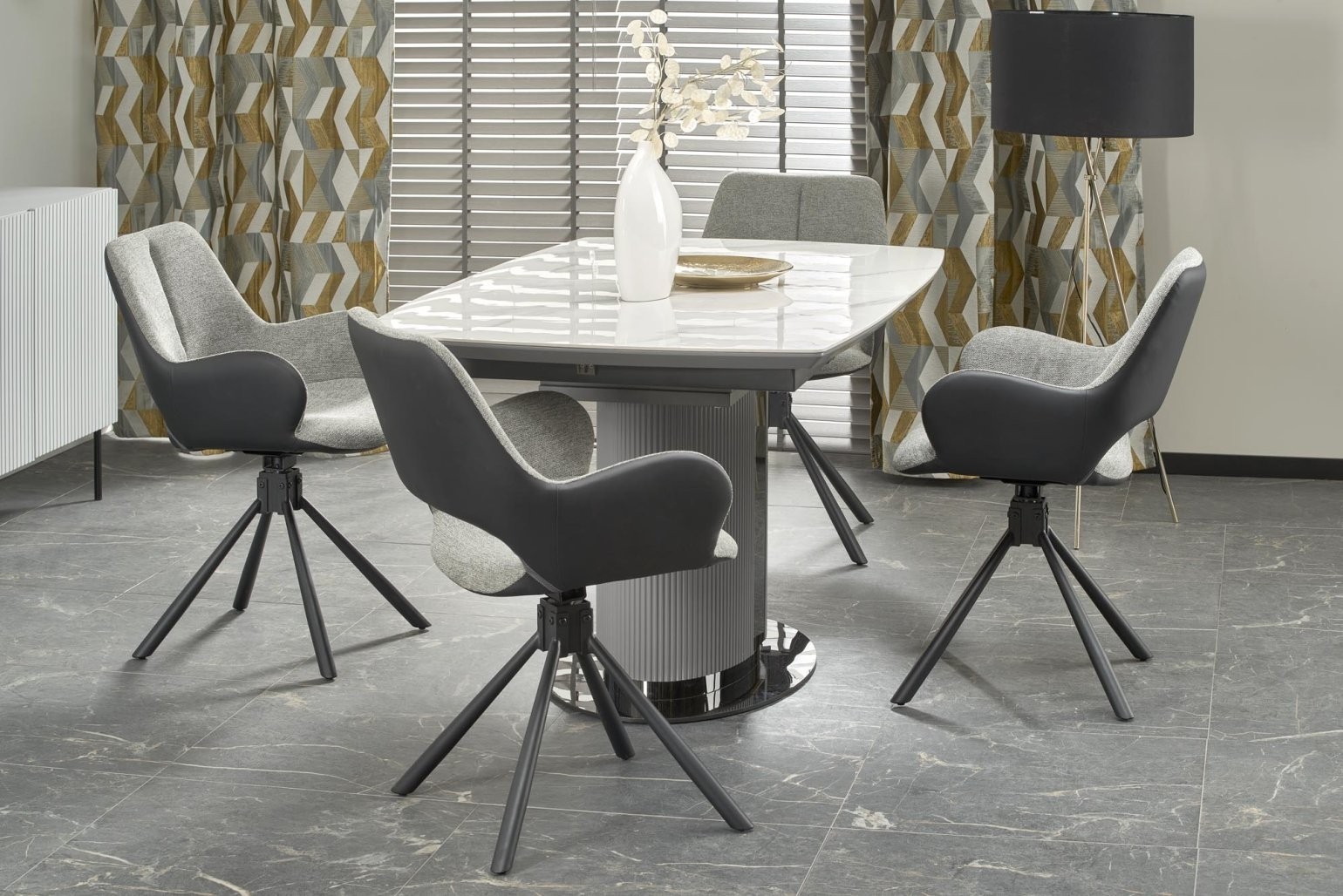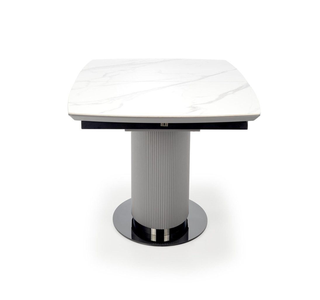 Raztegljiva jedilna miza Lerion v belem marmorju in sivo-črnem okvirju združuje eleganco in funkcionalnost. Prilagodljiva dolžina omogoča udobje za 6 do 10 oseb, primerna za sodobne interierje.