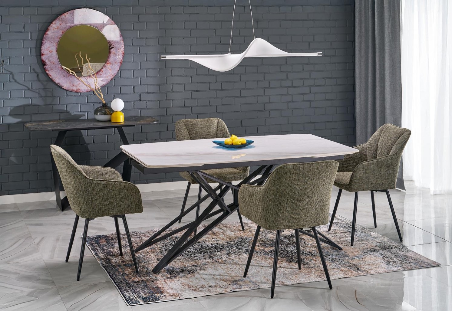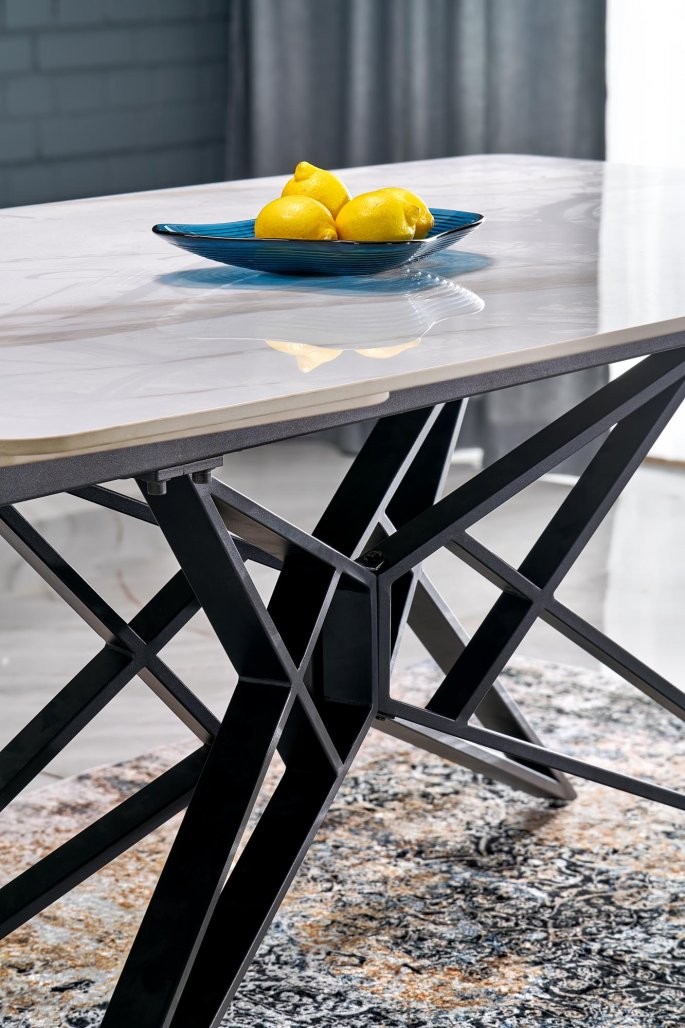 Miza Merla je izdelana iz visokokakovostnih materialov, ki zagotavljajo dolgotrajno vzdržljivost in estetsko dovršenost. Zgornja plošča je iz sintranega kamna v imitaciji belega marmorja, ki je znan po svoji trdnosti, odpornosti na praske in visoke temperature. Stabilno podnožje iz prašno lakiranega jekla v črni barvi pa poskrbi za izjemno stabilnost in minimalističen videz, ki se zlahka vključi v različne notranje stile.