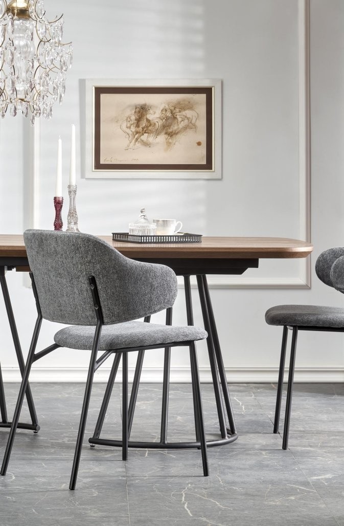 Raztegljiva jedilna miza Parel z oreho površino in črnim kovinskim okvirjem je idealna za večje obroke. Z možnostjo podaljšanja je primerna za 6 do 8 oseb in ustvarja topel, industrijski slog.