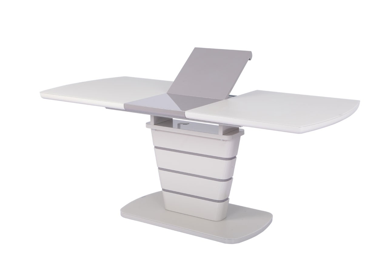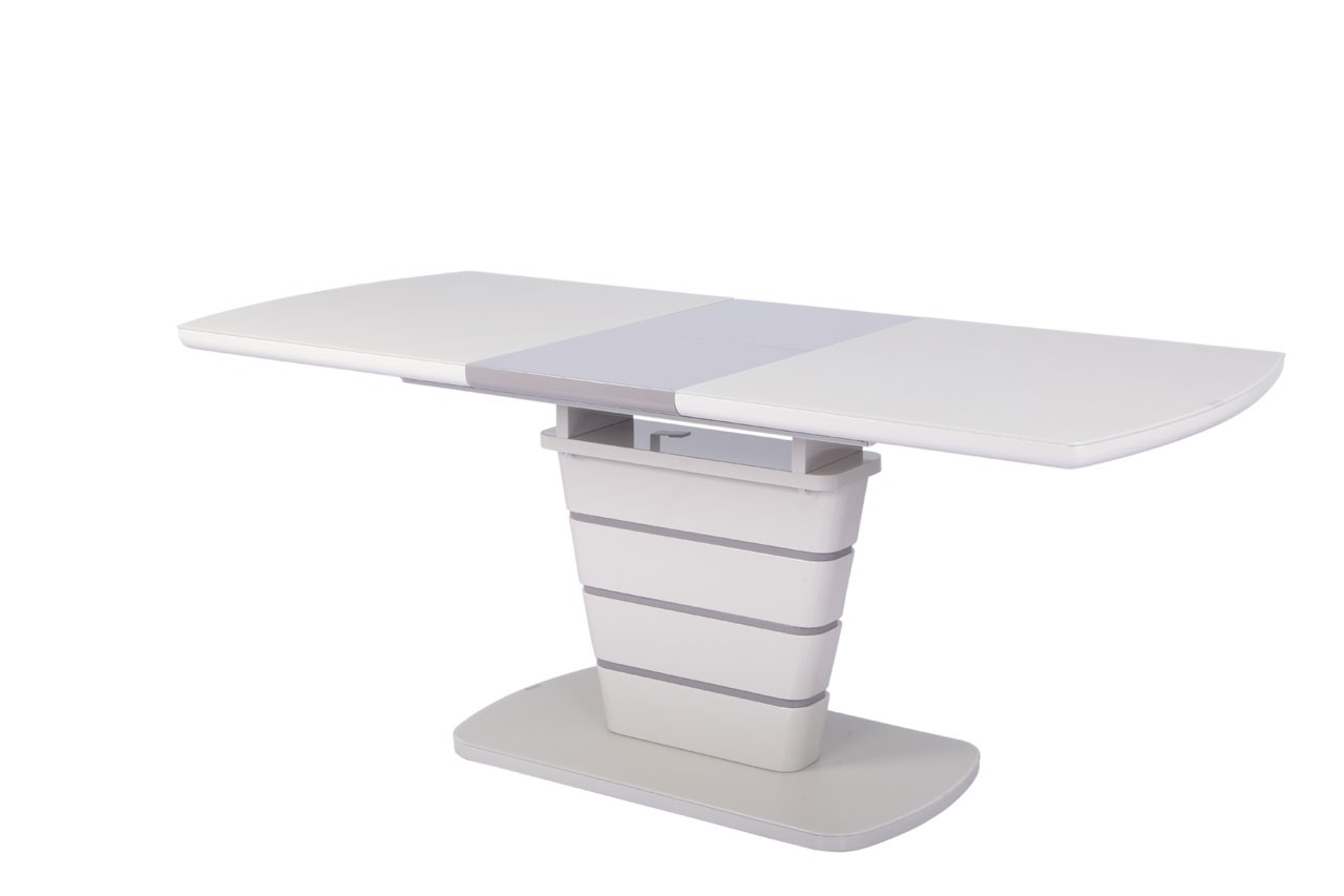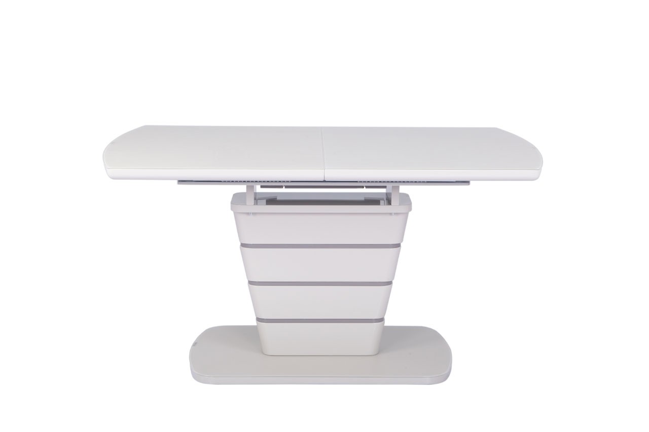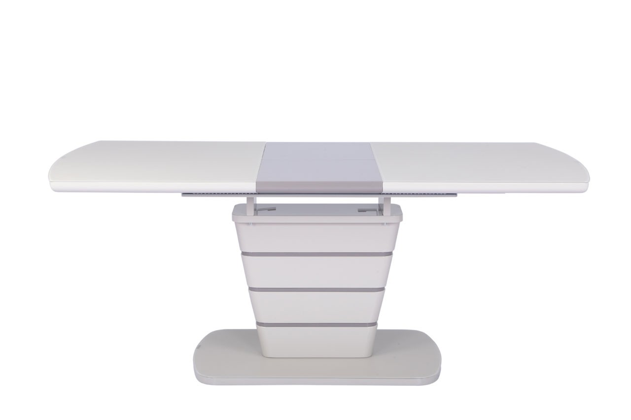 Zgornja plošča in steber sta narejena iz MDF materiala v visokem sijaju, ter prevlečena z matiranim steklom. Na sredini mize je kontrasten podaljšek, ki se z lahkoto izvleče in s tem podaljša mizo.