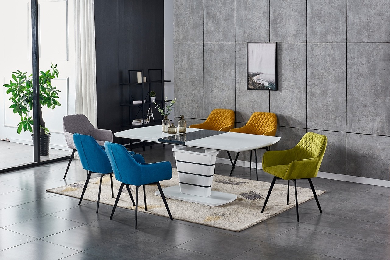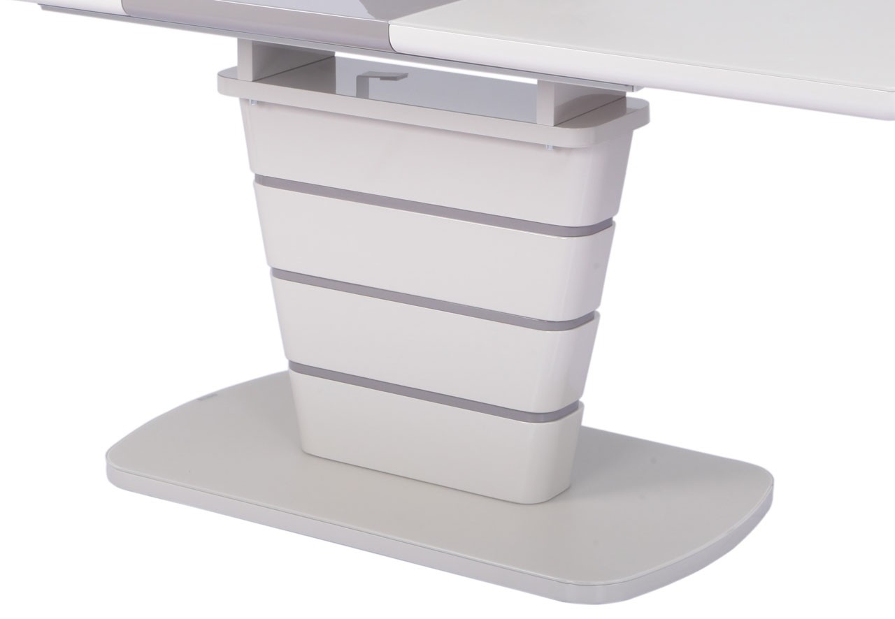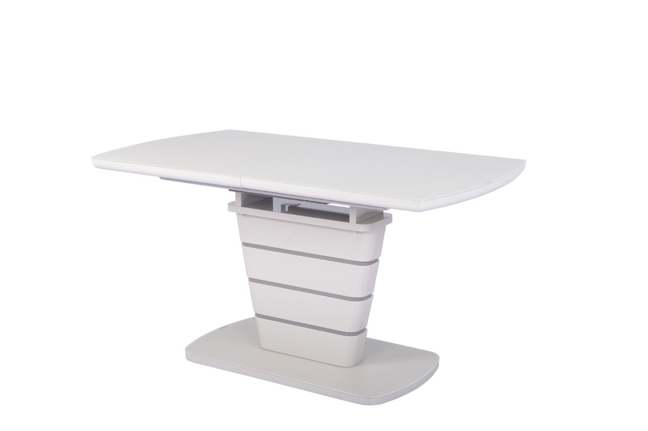 Zgornja plošča in steber sta narejena iz MDF materiala v visokem sijaju, ter prevlečena z matiranim steklom. Na sredini mize je kontrasten podaljšek, ki se z lahkoto izvleče in s tem podaljša mizo.