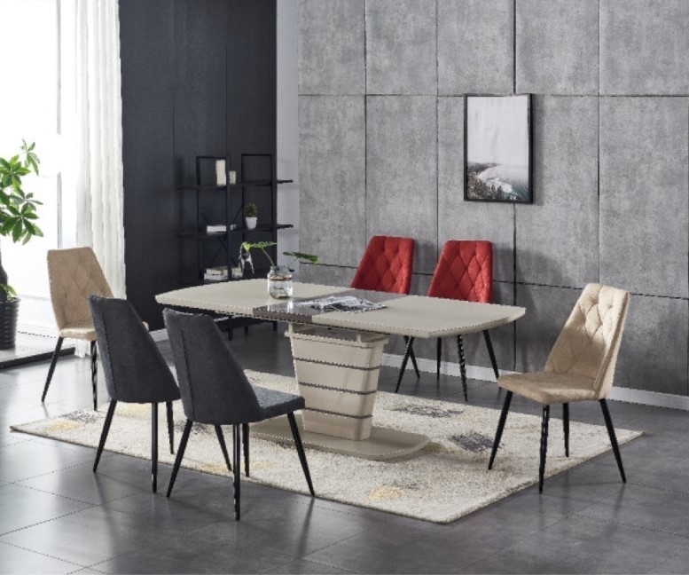 Zgornja plošča in steber sta narejena iz MDF materiala v visokem sijaju, ter prevlečena z matiranim steklom. Na sredini mize je kontrasten podaljšek, ki se z lahkoto izvleče in s tem podaljša mizo.