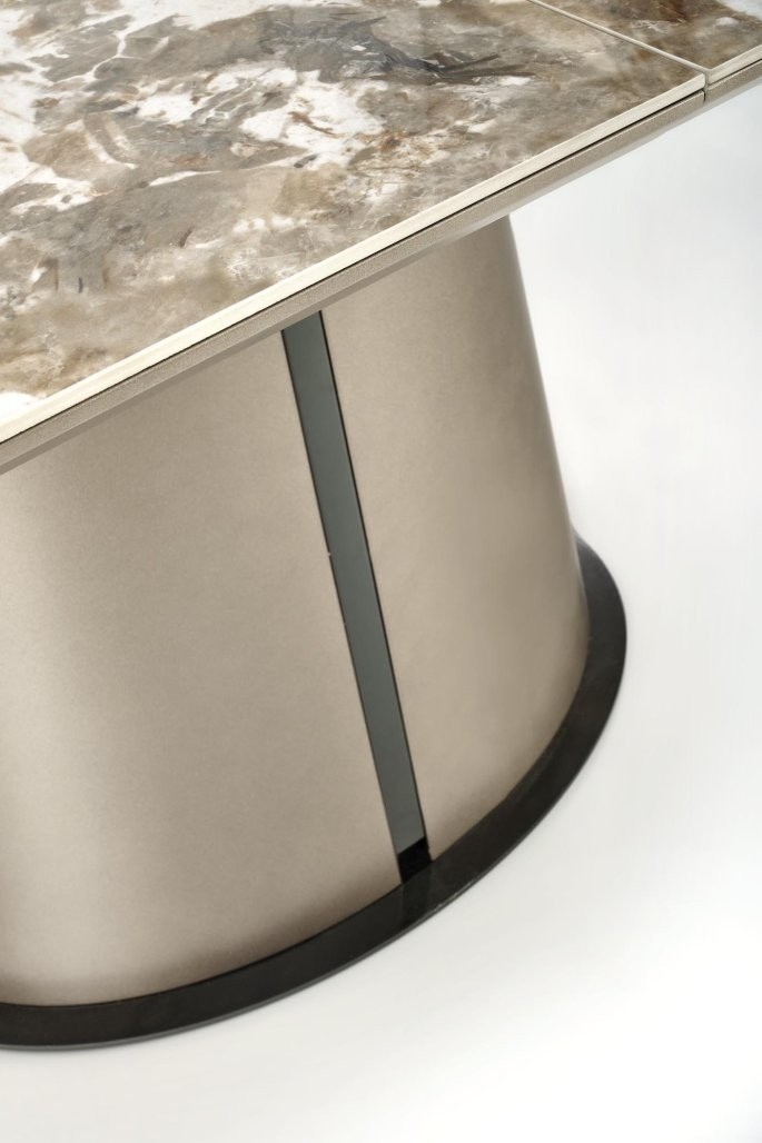 Raztegljiva jedilna miza Talan z ovalno keramično površino v bež marmornem videzu prinaša pridih prestižnosti v jedilnico in omogoča dovolj prostora za večje druženje.