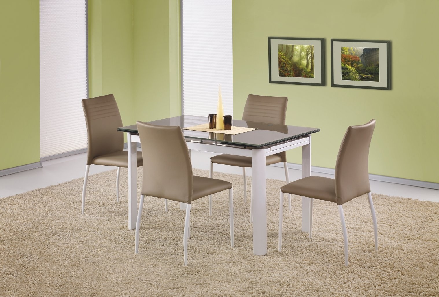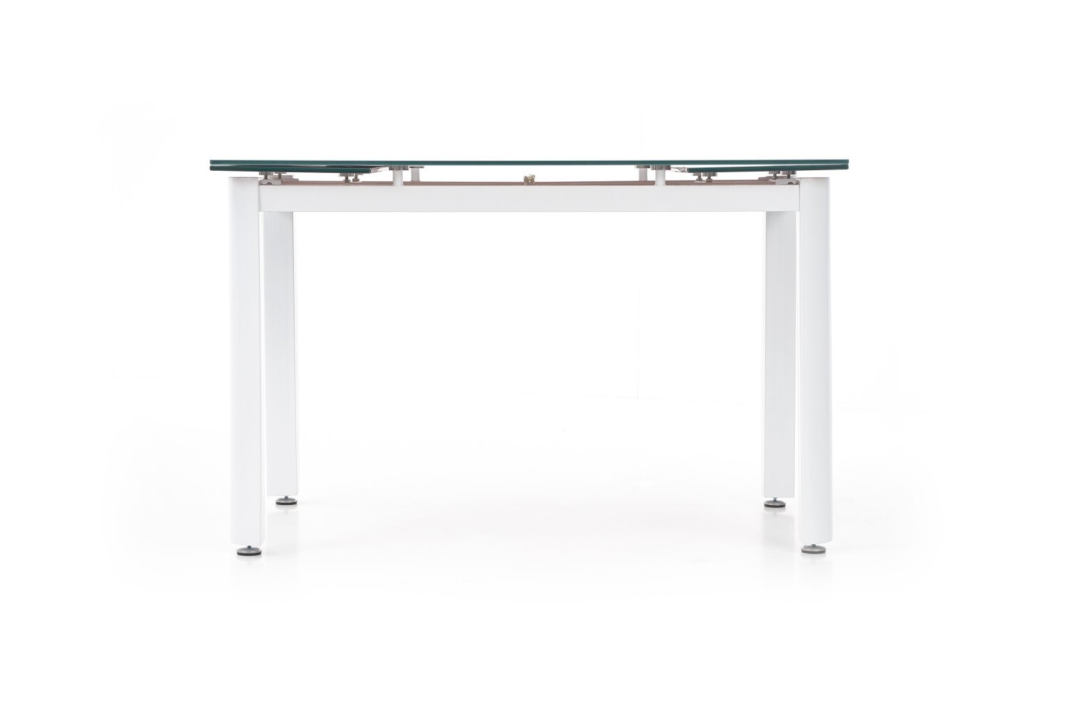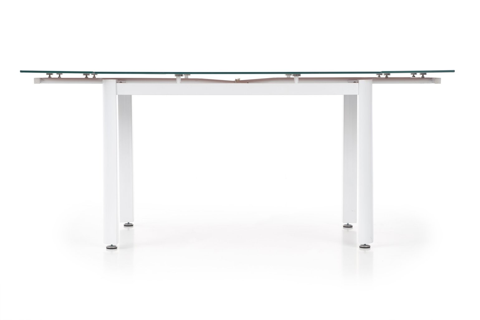 Raztegljiva jedilna miza Terin z bež stekleno ploščo in belim okvirjem prinaša eleganco v vsak dom. Prilagodljiv dizajn omogoča uporabo za 4 do 8 oseb in je idealen za večje družinske obroke.