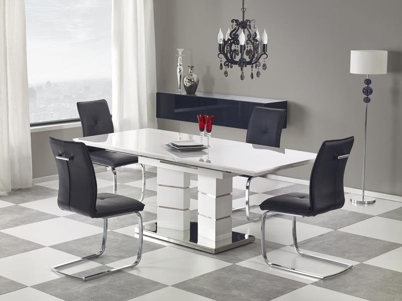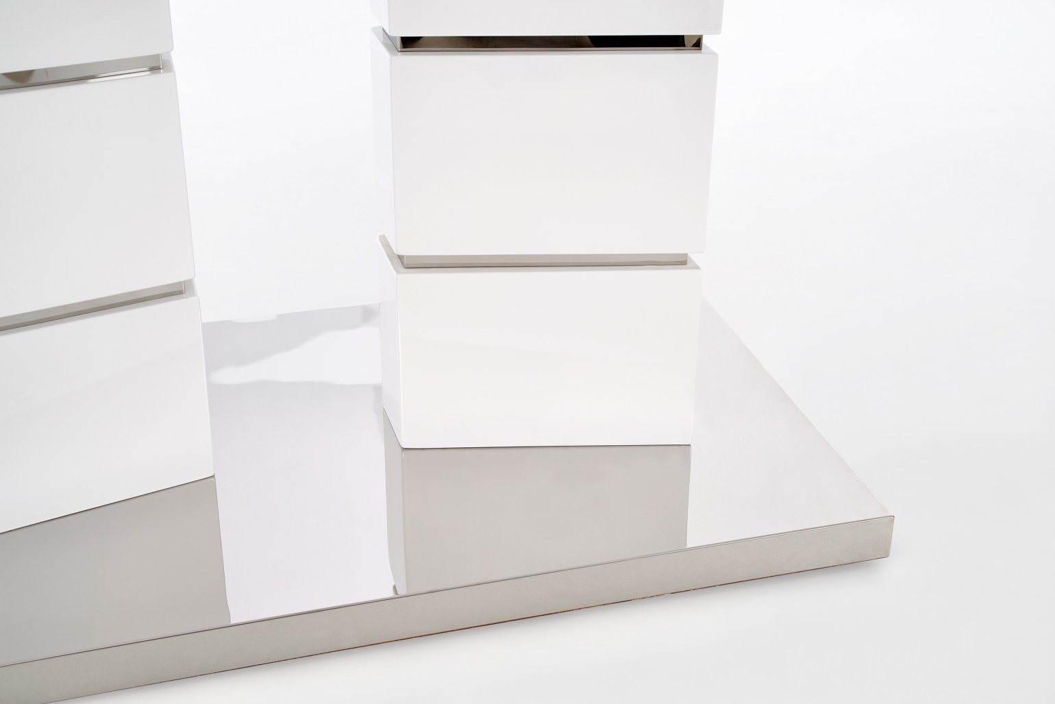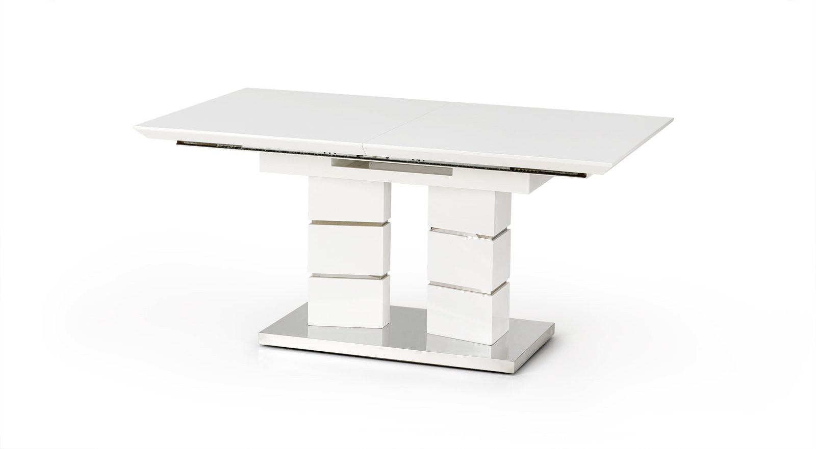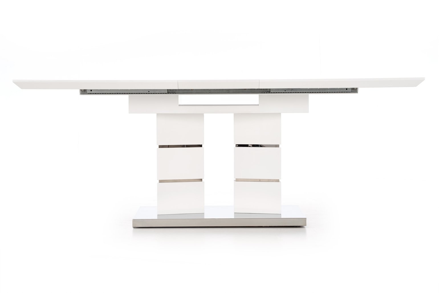 Raztegljiva jedilna miza Ulin z lakirano MDF ploščo v beli barvi in nerjavnim jeklenim ogrodjem. Primerna za 6 do 8 oseb, s funkcionalnim raztegom za večje število gostov.
