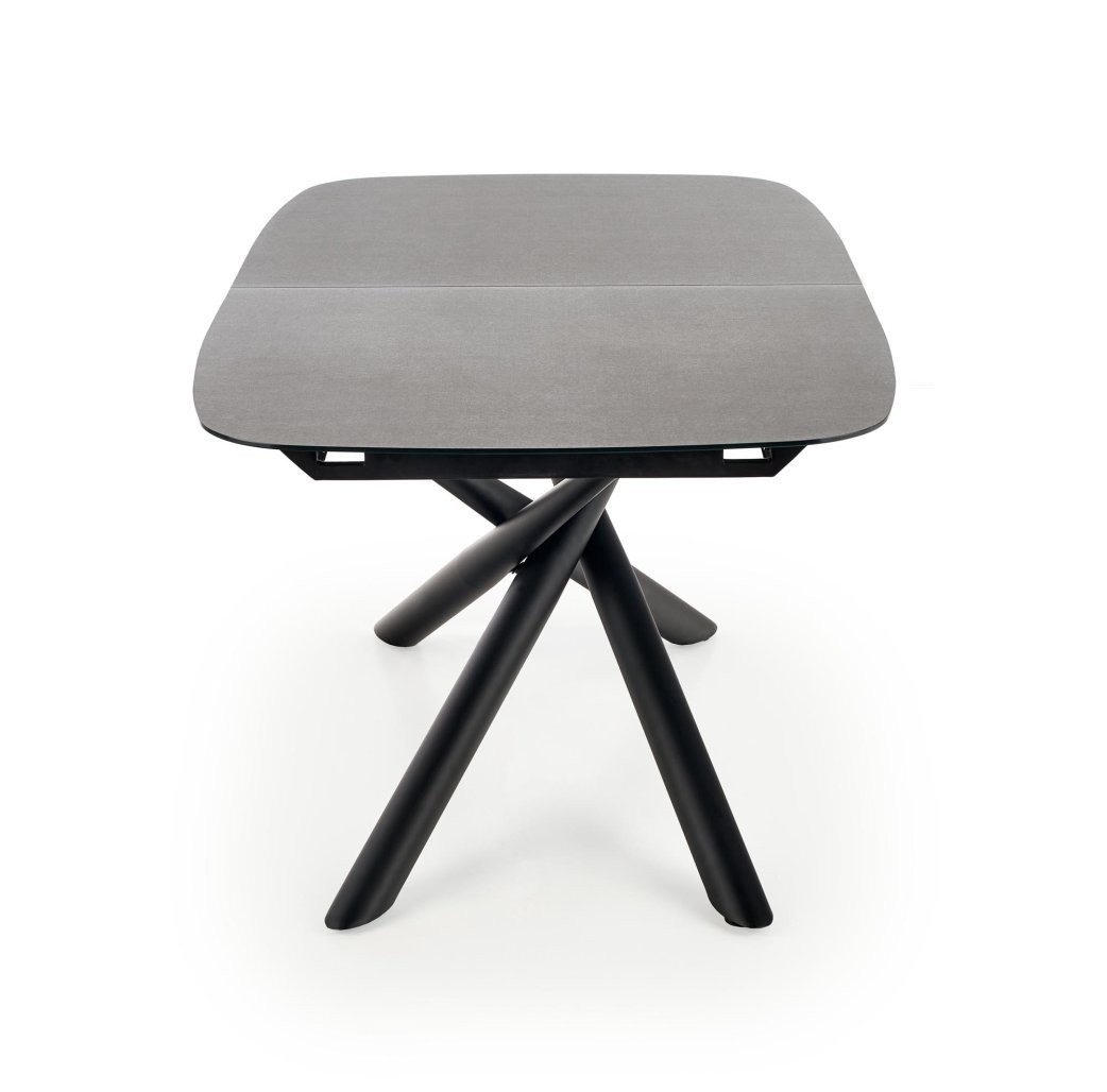 Raztegljiva jedilna miza Urion s stekleno površino in črnim kovinskim okvirjem. Prilagodljiva dolžina omogoča udobno postrežbo za 8 do 10 oseb.
