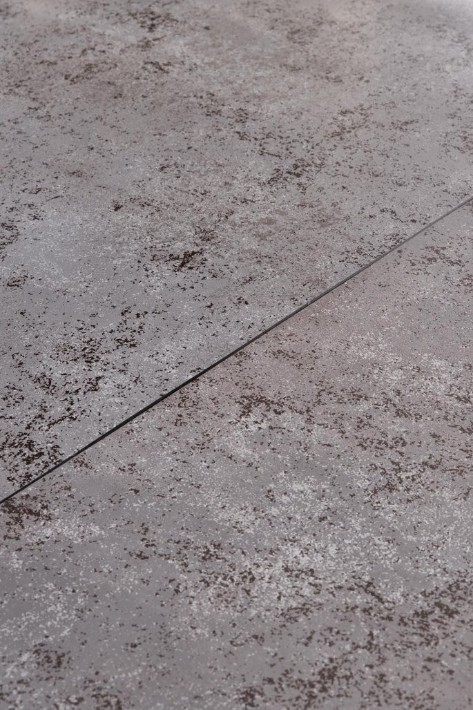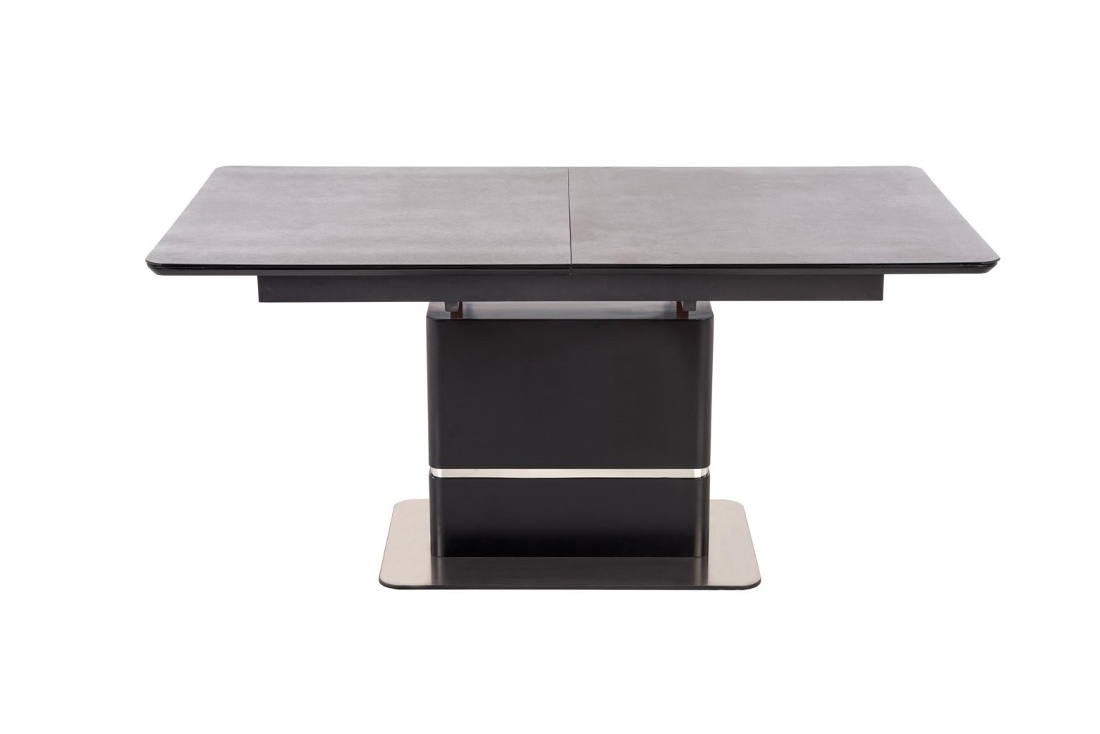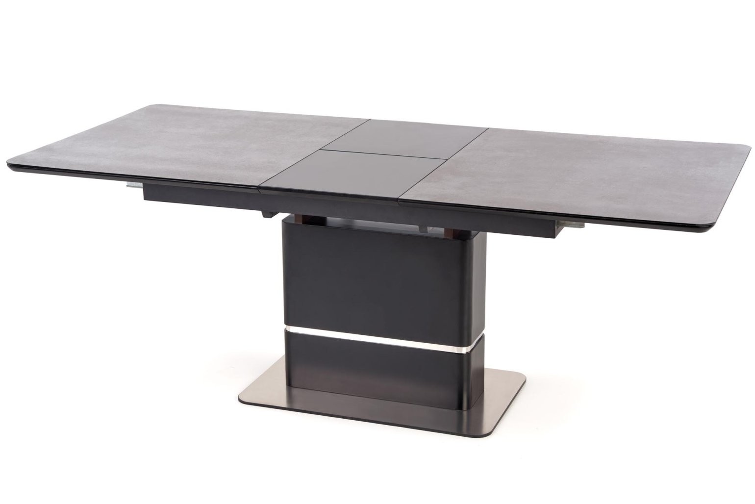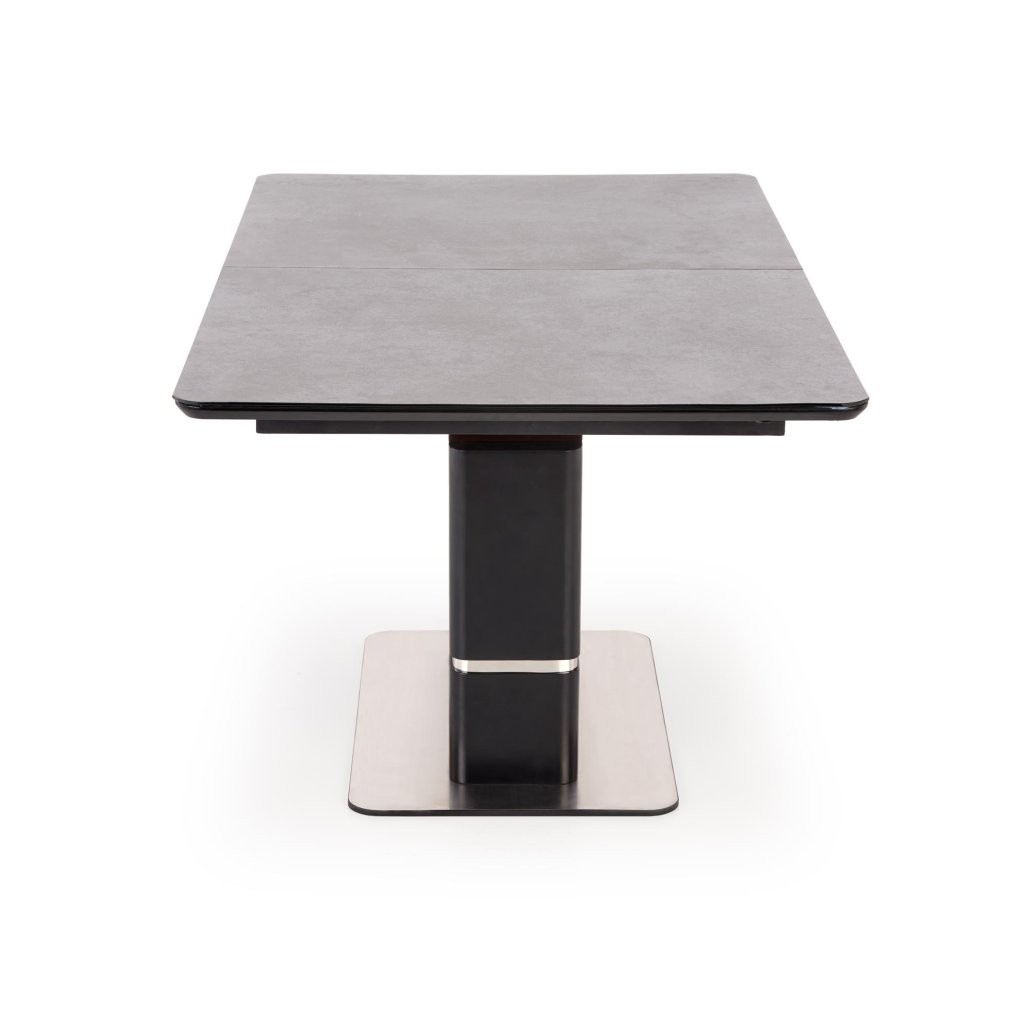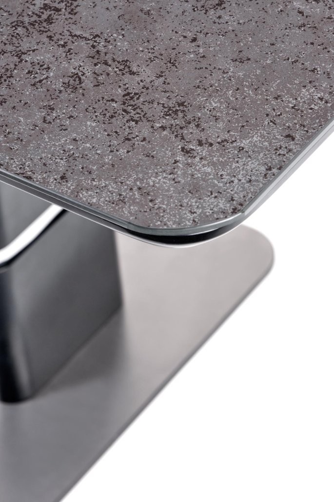 Raztegljiva jedilna miza Veln s temno sivo stekleno ploščo in črnimi kovinskimi nogami. Sodobna oblika z možnostjo raztega, idealna za 6 do 8 oseb.
