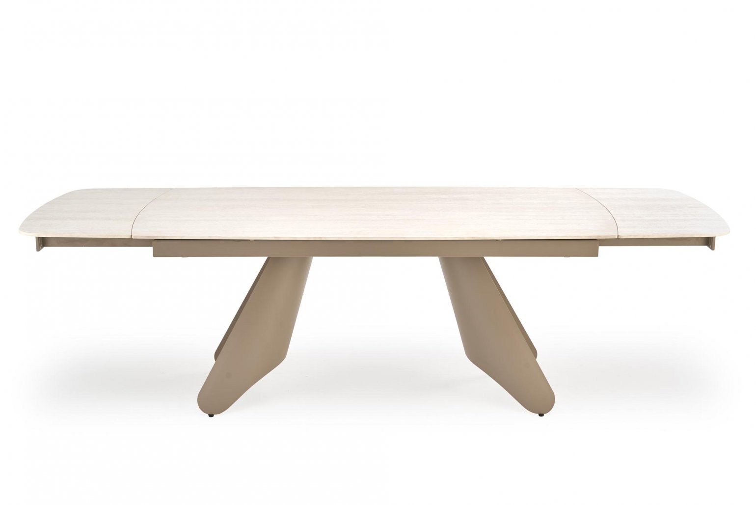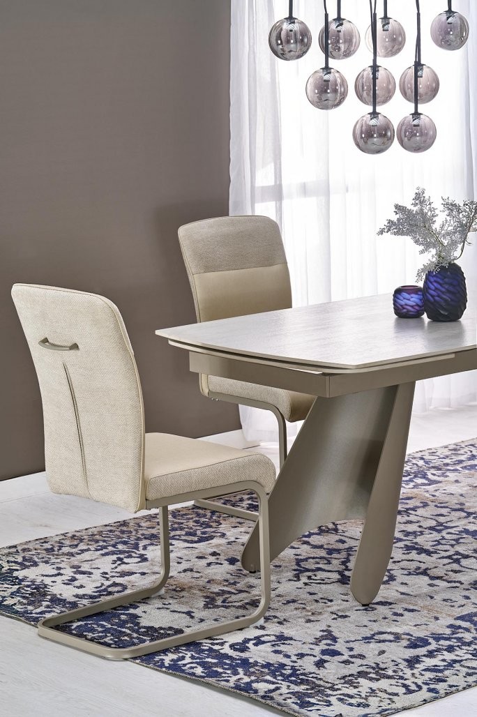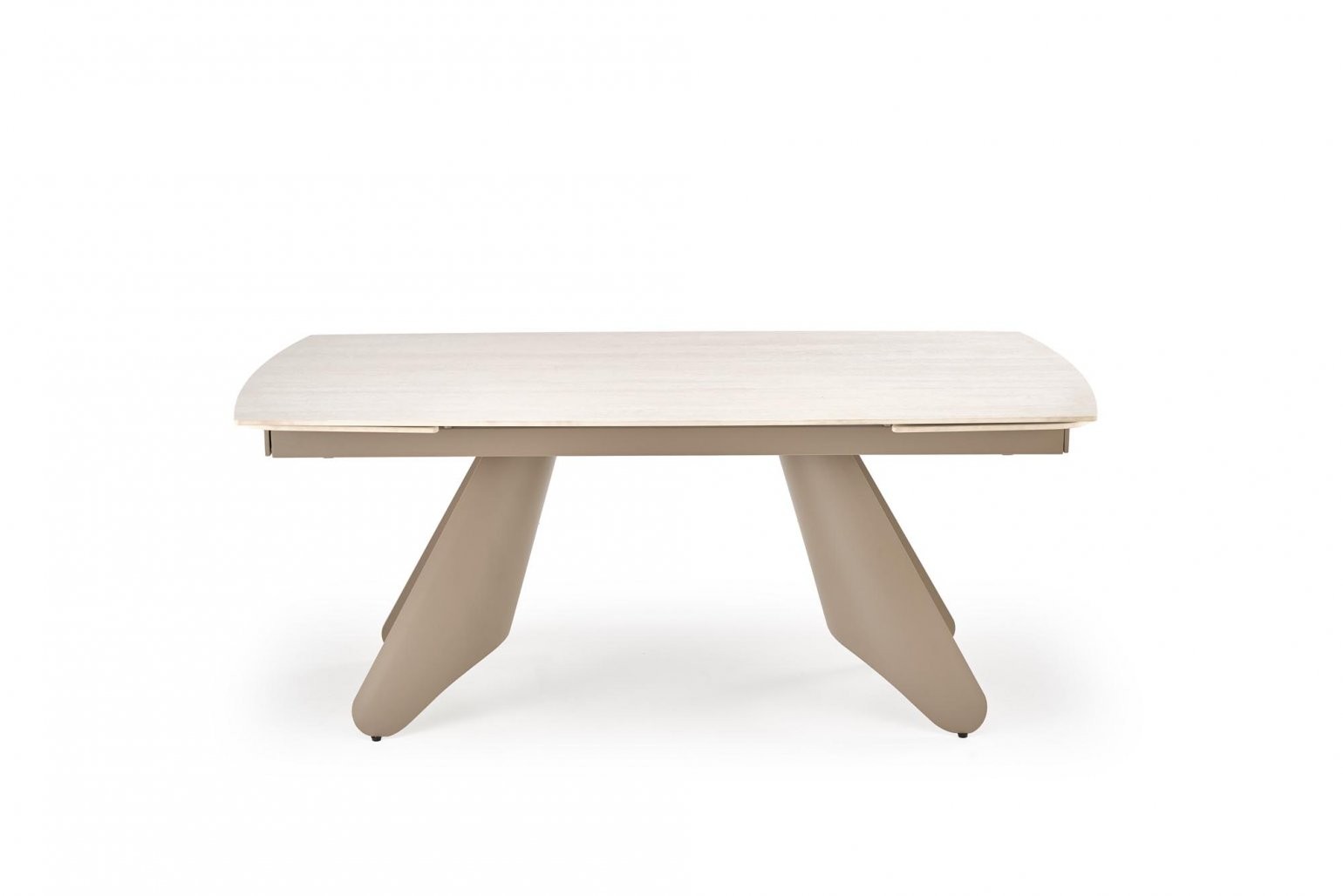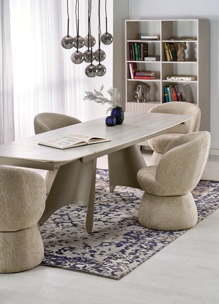 Miza je izdelana iz visokokakovostnih materialov, ki zagotavljajo dolgotrajno vzdržljivost. Mizna plošča je iz sintranega kamna, ki je znan po svoji odpornosti na praske in toploto, medtem ko so noge iz prašno lakiranega jekla. Elegantna barvna kombinacija vrha v imitaciji travertina in nog v barvi kašmirja prinaša topel in sodoben videz. Z nosilnostjo do 60 kg je ta miza robustna in zanesljiva izbira.