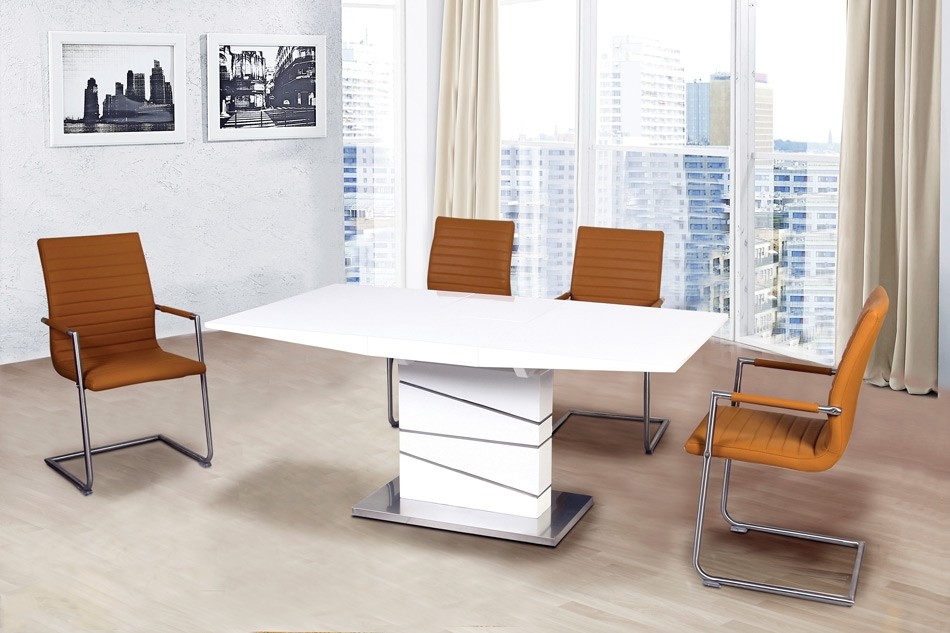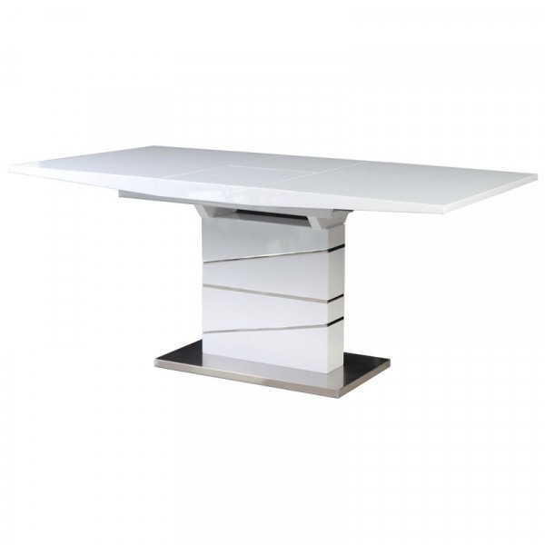 Raztegljiva miza MAJA je odlična izbira za vse, ki iščejo elegantno in kakovostno pohištvo. Narejena iz MDF materiala z sredinskim raztegom. Mizna plošča je v belem visokem sijaju, podnožje pa iz nerjavečega jekla.