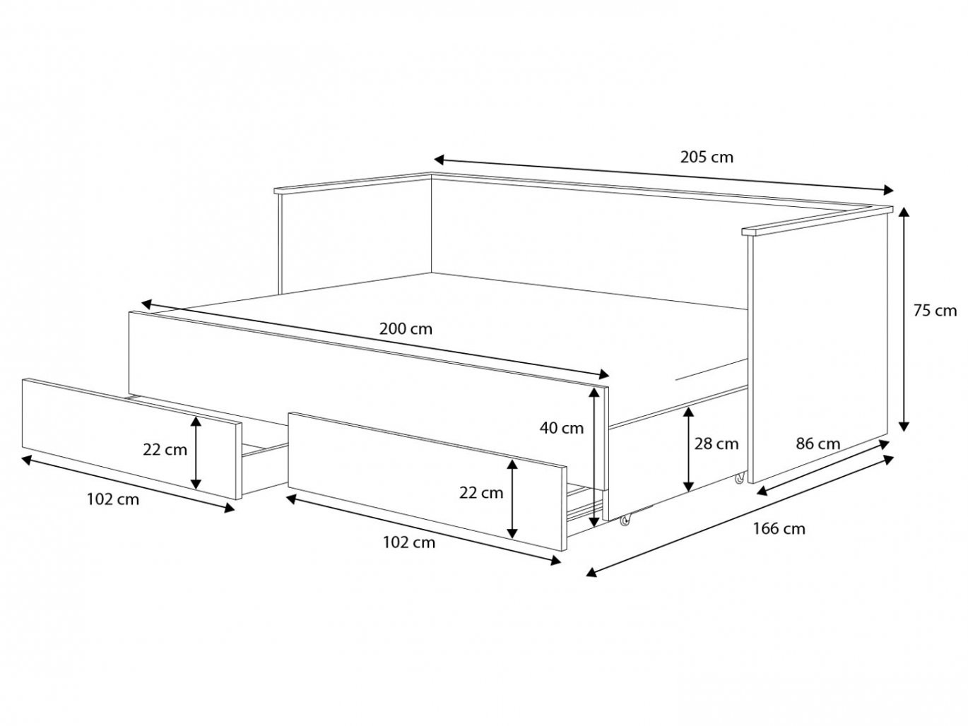 Postelja je funkcionalna in estetsko dovršena, primerna za vsakodnevno uporabo kot kavč ali postelja. Vključuje dve vzmetnici in ima priročen prostor za shranjevanje posteljnine.