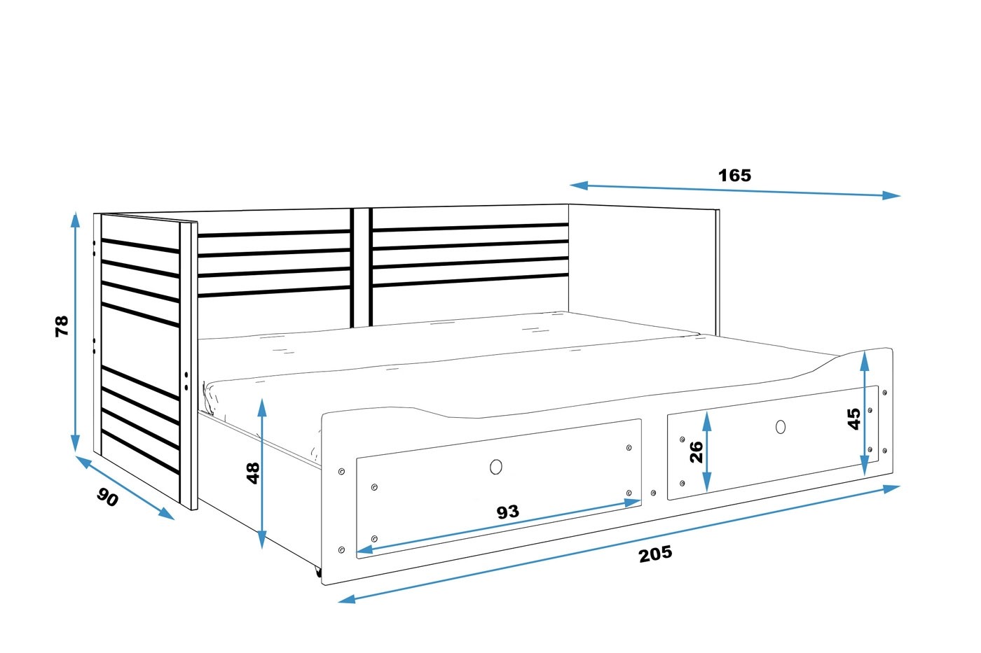 Penasti ležišči sta velikosti 80x200x9cm. Ko je postelja raztegnjena je velikost ležišča 160x200 cm.