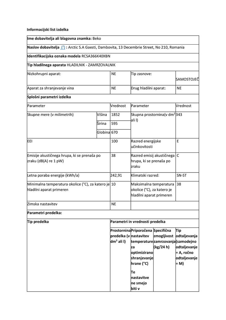 Kombinirani hladilnik Beko RCSA366K40XBN z zamrzovalnikom spodaj se ponaša z 223 l hladilnega dela hladilnega in 120 l zamrzovalnega dela. Zamrzovalni del ima 3 prostorne predale. Odlikujejo ga štiri steklene police, predal za sadje in zelenjavo, zaradi posebnih tečajev pa se vrata odpirajo vzporedno s stransko stranico hladilnika. Možnost zamenjave strani odpiranja vrat omogoča prilagajanje vsakemu prostoru. Kombinirani hladilnik se nahaja v energijskem razredu E glasnost njegovega delovanja pa znaša 38 dB.