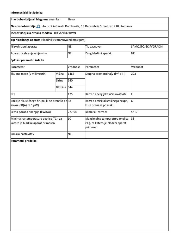 BEKO RDSA240K30WN Hladilnik z zamrzovalnikom zgoraj