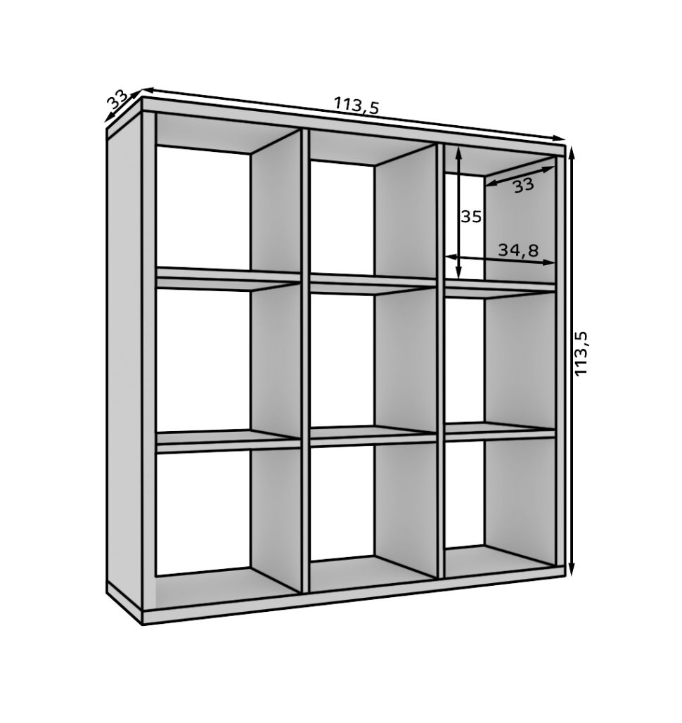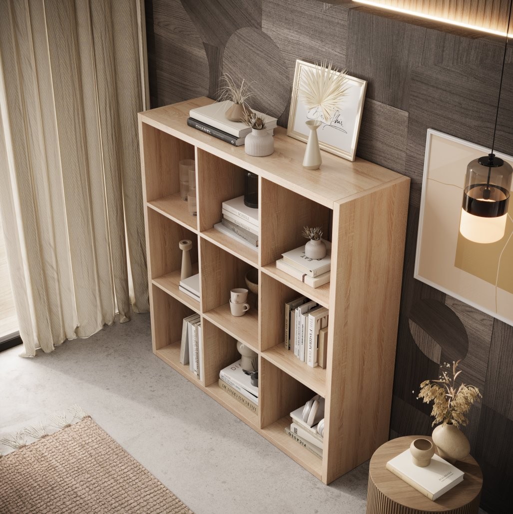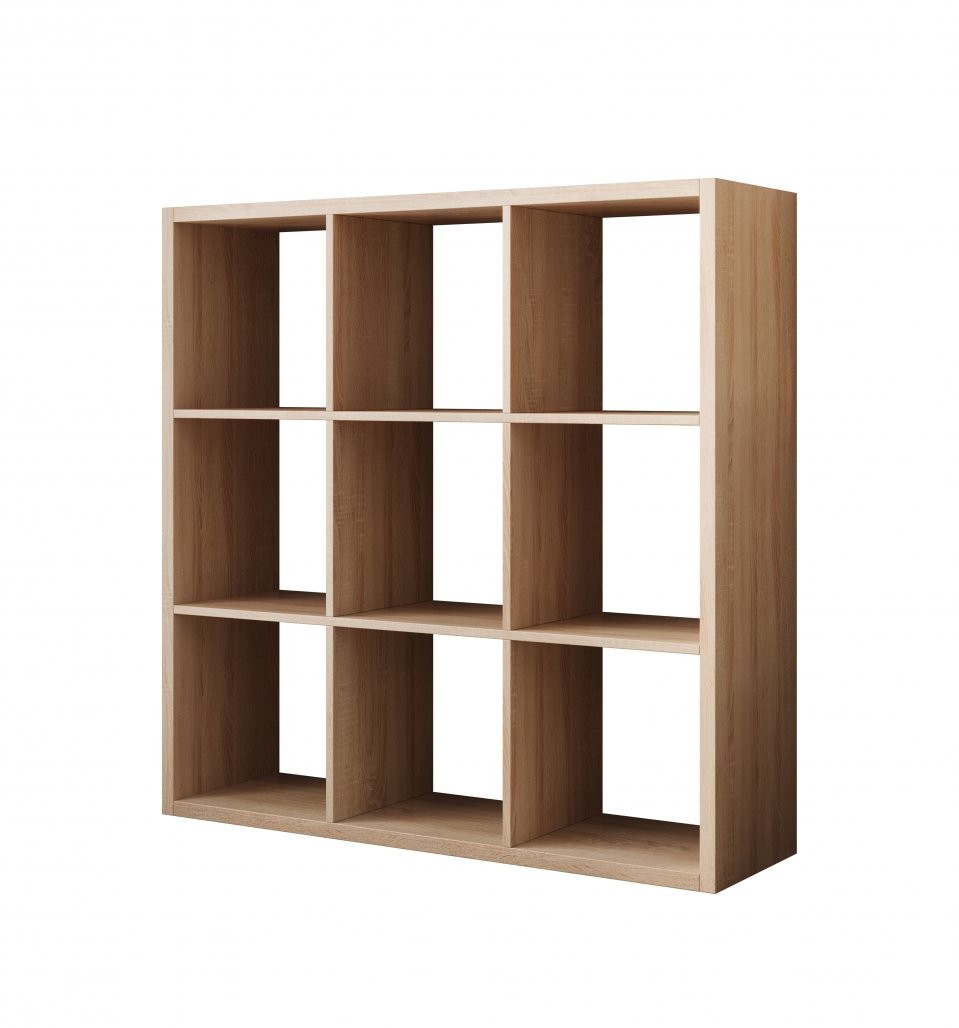 Regal Cleo VI je popolna izbira za vse, ki iščete praktično in estetsko dovršeno rešitev za shranjevanje in razstavljanje predmetov. S svojo kvadratno konstrukcijo in devetimi simetrično razporejenimi policami ponuja obilico prostora in urejen videz.