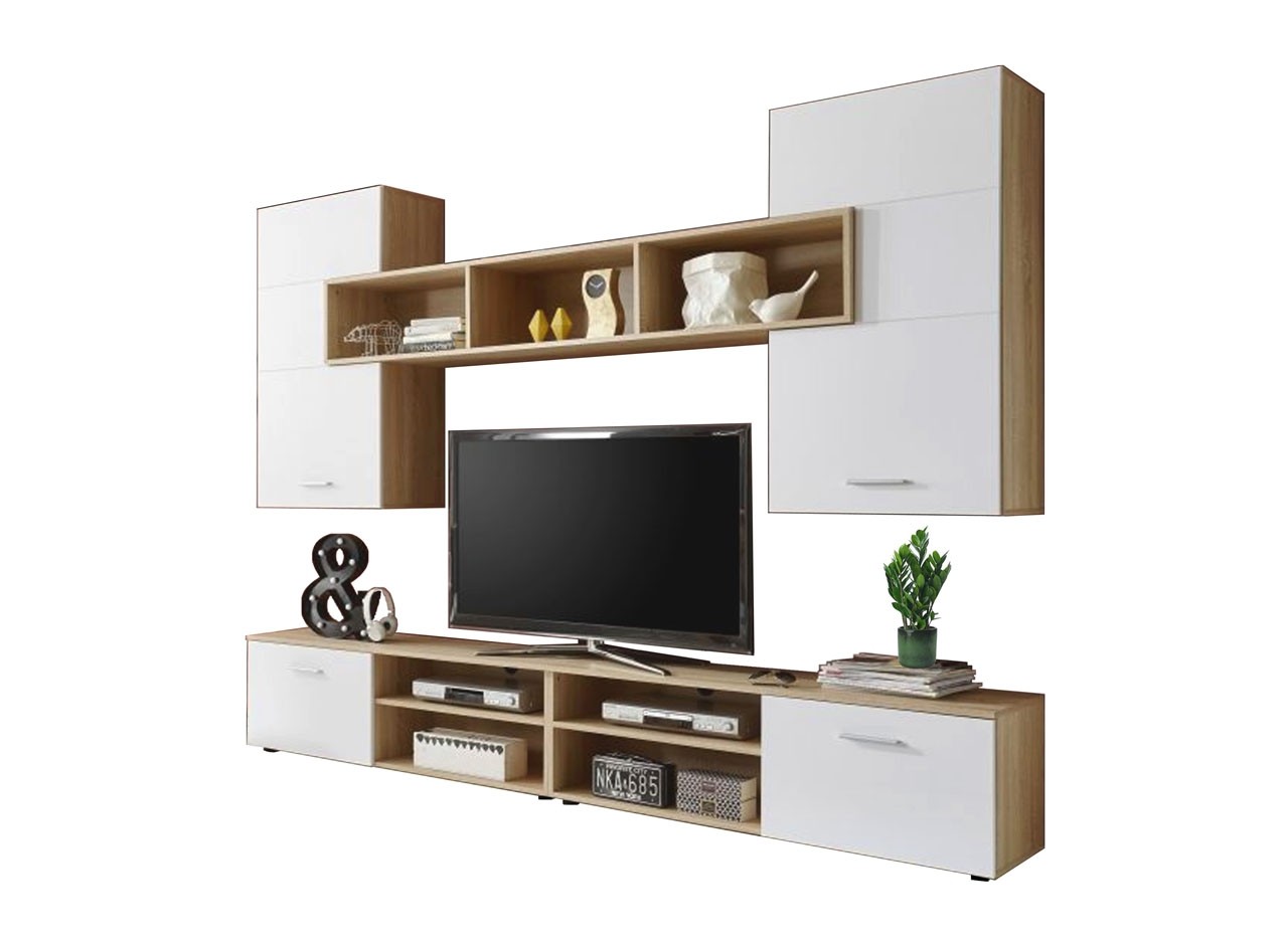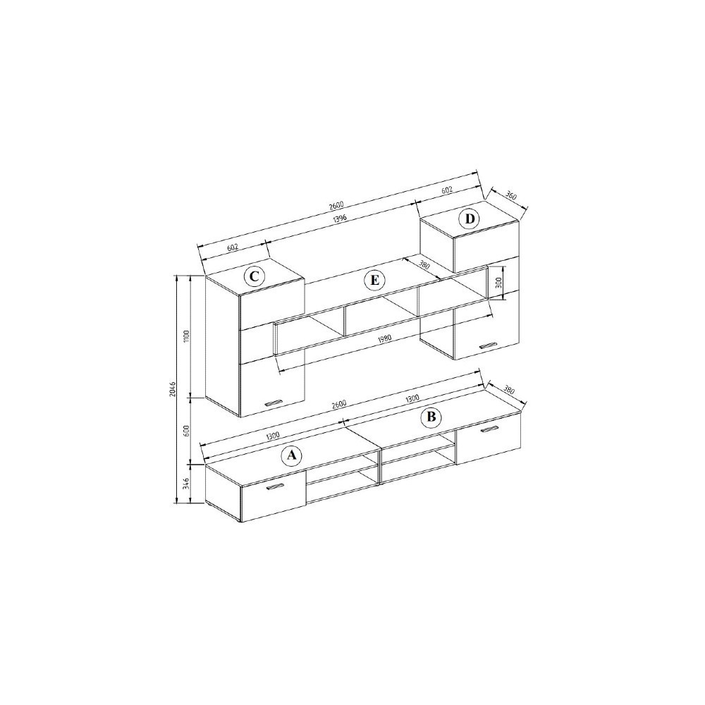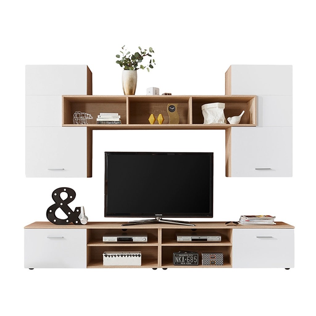 Spodnji del je sestavljen iz dvhe nizkhi komod s policami in zaprtimi prostori za odlaganje. Ta del je obogaten z mehanizmom proti prevračanju tako da je za varnost zagotovljeno. Zgornji del je sestavljen iz dveh omaric in odprte police, tako da v njega lahko shranite vse kar želite imeti skrito ali razstavljeno.