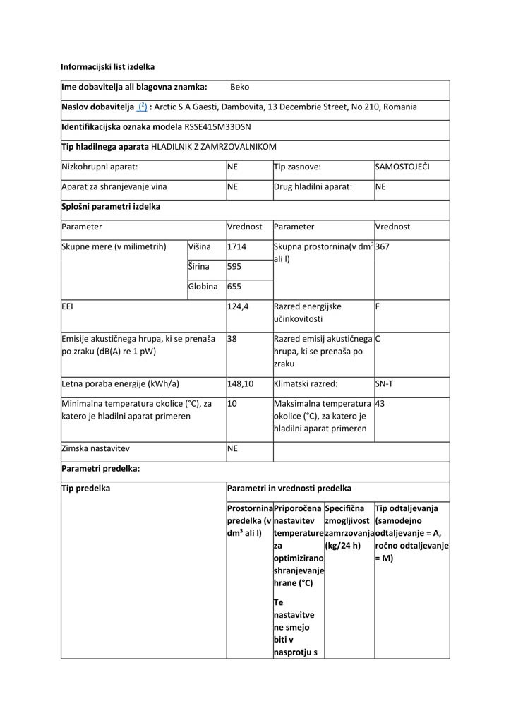 Enovratni hladilnik Beko RSSE415M33DSN je idealen pomočnik vašega gospodinjstva. Ponaša se z dispenzerjem za vodo v vratih, šestimi steklenimi policami in predalom za sadje ter zelenjavo s pomočjo katerega bodo vaša živila vedno sveža, zdrava in skrbno shranjena. Enovratni hladilnik odlikuje energetski razred F in glasnost 38dB. Velika prostornina 359 litrov omogoča hrambo velike količine živil. Možnost zamenjave strani odpiranja vrat omogoča prilagajanje vsakemu prostoru.