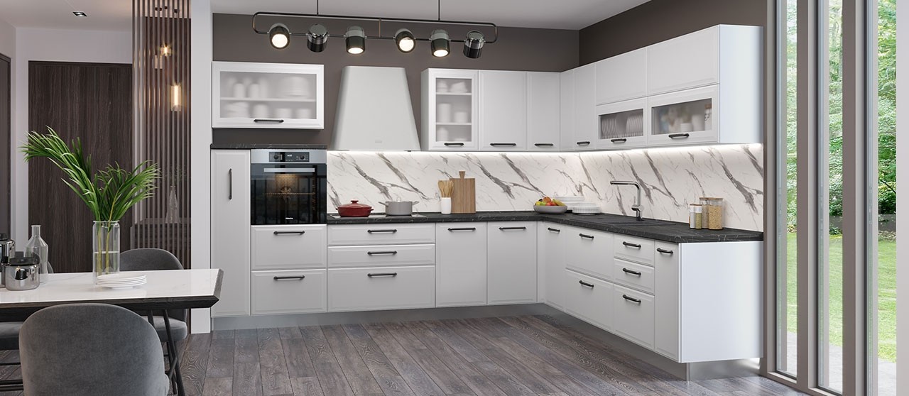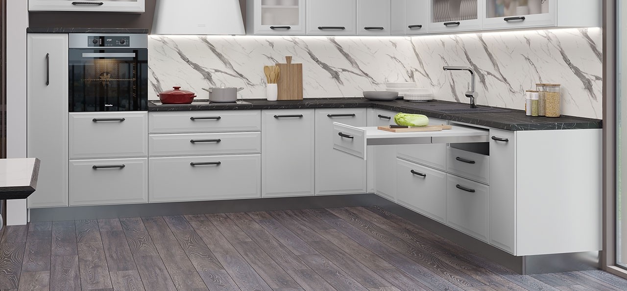 Kuhinja EVIA je na voljo v univerzalnem dizajnu, ki se lepo poda tako z modernim kot s klasičnim stilom, zato izgleda odlično v vsakem domu! Na voljo je v svetli barvi sive perle, ki se enostavno kombinira s katerokoli drugo barvo, zato se bo kuhinja lepo podala s katerokoli barvo tal in sten.