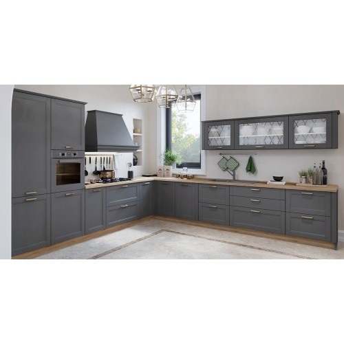 Privoščite si rustikalno, funkcionalno in kvalitetno kuhinjo EVIA, ki vas bo vsak dan znova navdušila, zato boste v njej z veseljem kuhali, pekli in preživljali dragoceni prosti čas s svojimi najdražjimi! Kuhinja vsebuje številne priročne elemente, ki so na voljo v perla mat sivi barvi, ki izgleda odlično v vsakem domu. Dimenzije celotnega sestava so 329 x 274 cm.