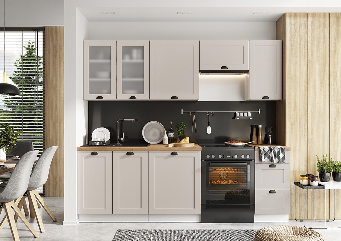 Kuhinja ADELE je kvalitetno izdelana kuhinja modernega videza, ki se odlično poda v vsak dom. Kuhinja je sestavljena iz 7-ih elementov, ki vam nudijo obilo prostora za shranjevanje posod, jedilnega pribora in živilskih izdelkov, hkrati pa vaši kuhinji nudijo moderni in minimalistični videz.