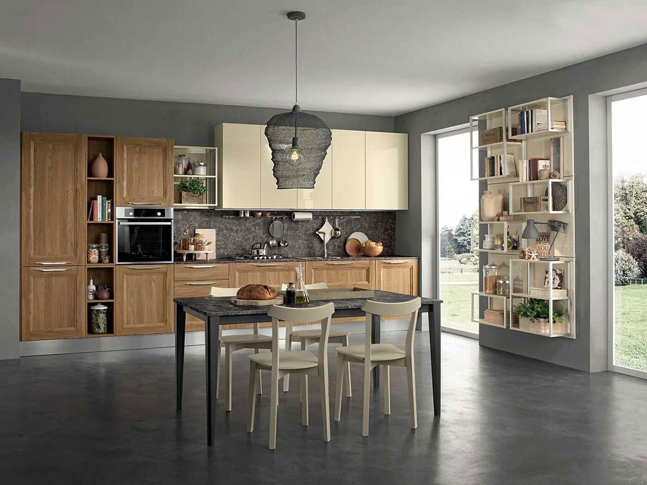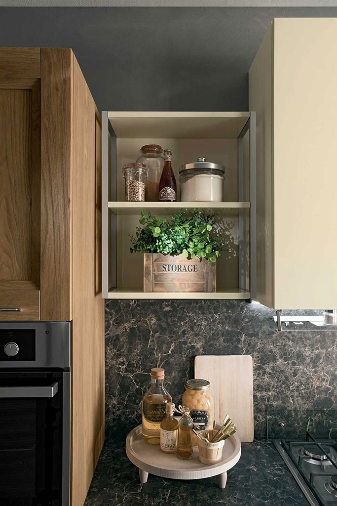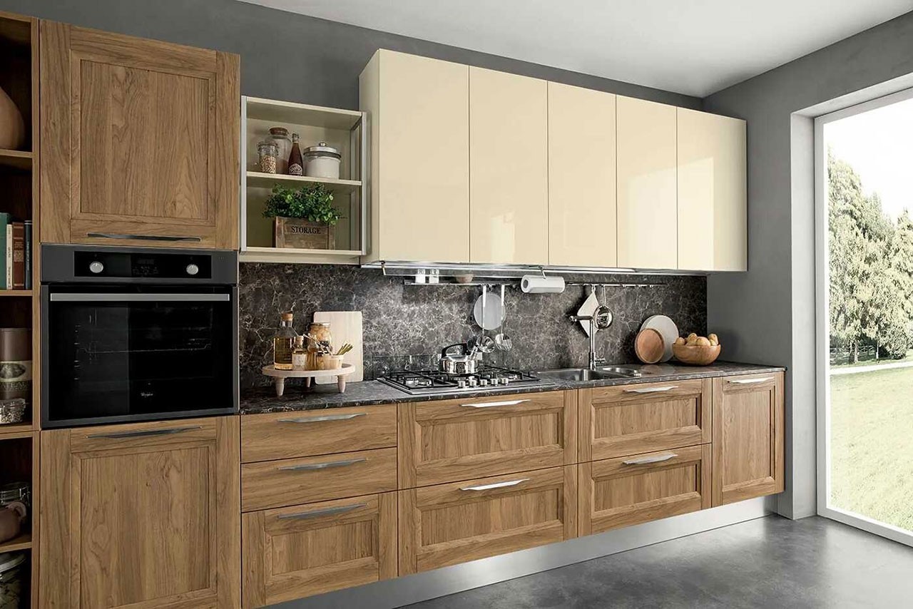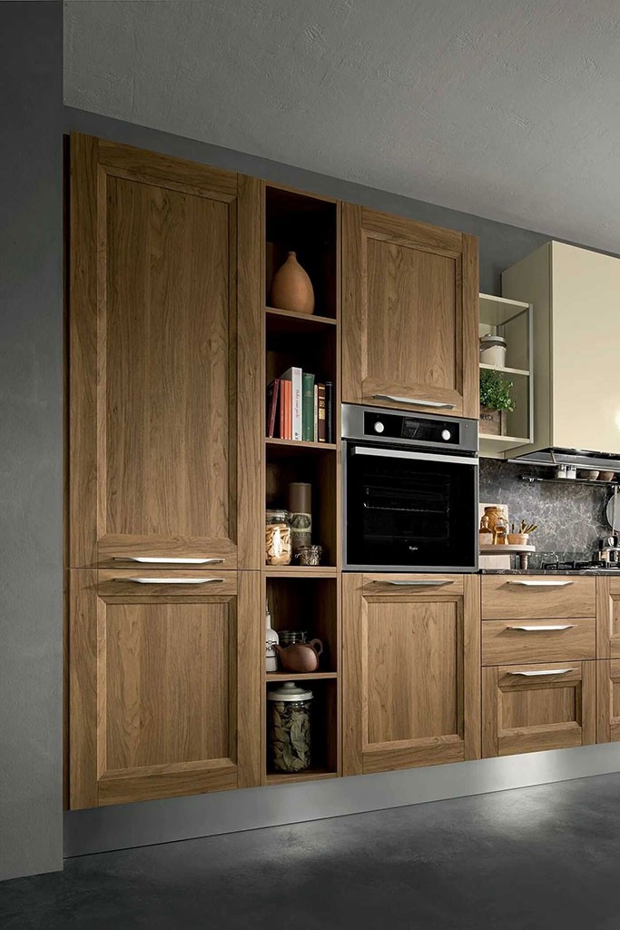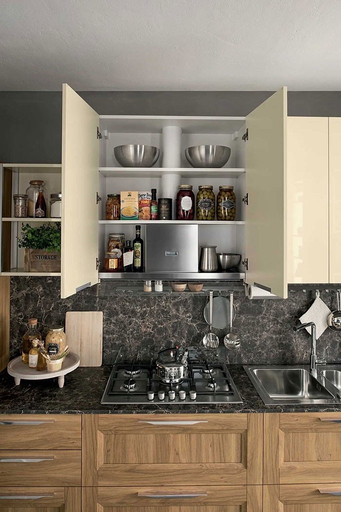 Kuhinja RIVIERA je sestavljena iz številnih različnih elementov, ki vam nudijo obilo prostora za shranjevanje hrane, posode, kozarcev in vseh ostalih kuhinjskih pripomočkov. Kuhinjski pult vam nudi obilo delovne površine na katero lahko odložite aparat za kavo, toaster, grelnik vode in obilo drugih aparatov.