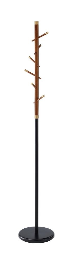 Samostoječ obešalnik Orian s kromiranim in prašno lakiranim jeklom. Zlata, orehova in črna barva za eleganten videz v klasičnem slogu.