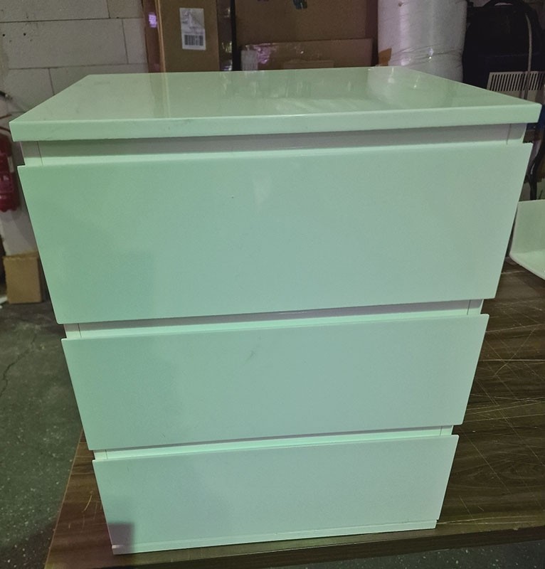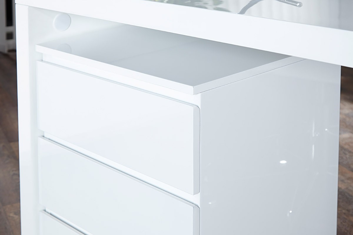 PREDALNIK PANTER je moderni predalnik v beli barvi v visokem sijaju, ki je idealen dodatek h vaši pisalni mizi, saj ima tri prostorne predale, kamor lahko pospravite vse vaše pomembne papirje in pisarniško galanterijo, in tako ohranite čisto in urejeno delovno površino. Plošče predalnika so rahlo zaobljene, kar omogoča lažje odpiranje. Predalnik lahko pospravite pod mizo in tako ohranite videz večjega prostora.