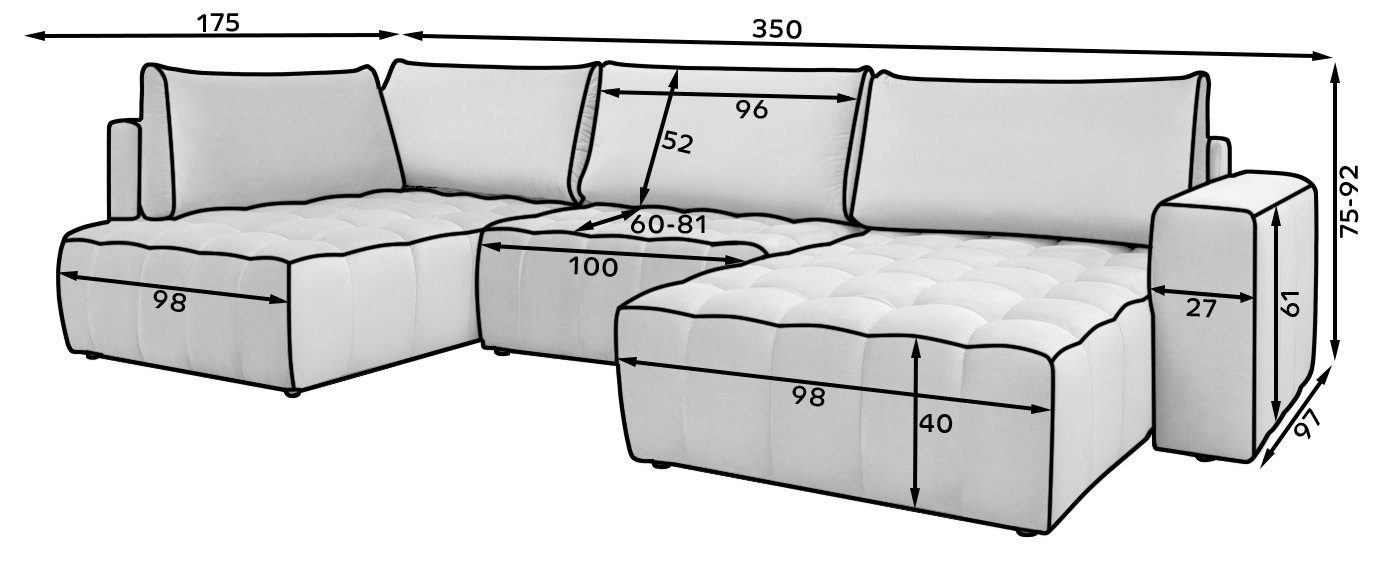 - Dimenzije garniture: 340 cm (širina) x 170 cm (globina) x 92 cm (višina)