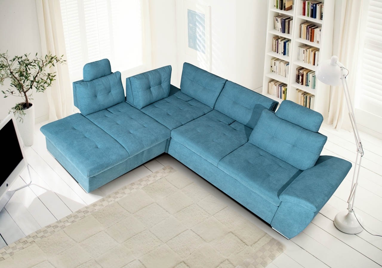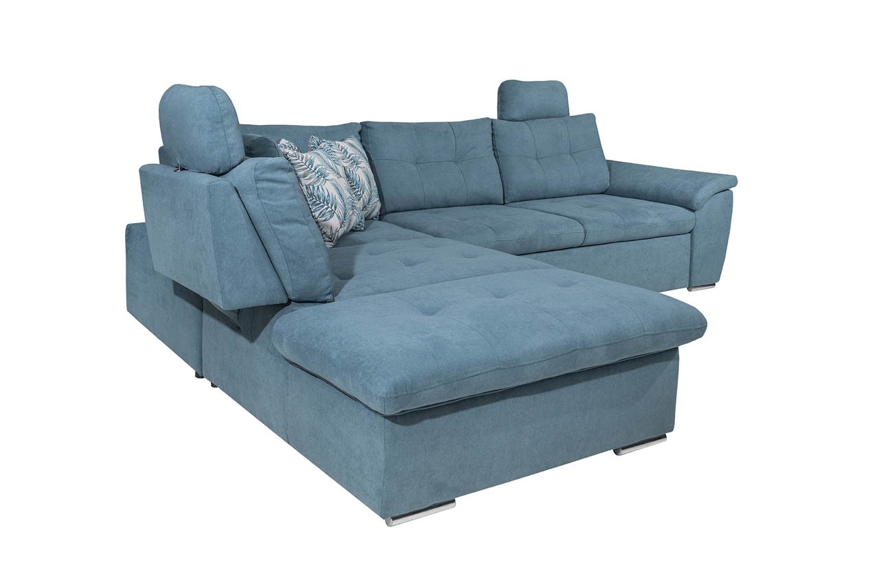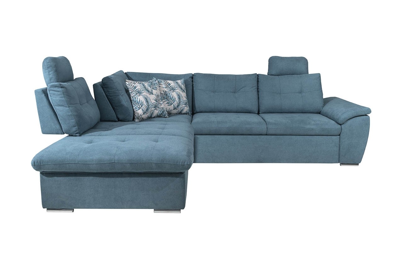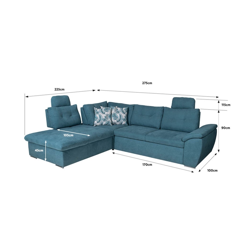 Kotna sedežna garnitura CASCADA je modernega izgleda na voljo v nežni modri barvi, ki dnevni prostor poživi. Celotna garnitura je oblečena v mehko tkanino, hrbtišča sedežne pa se lahko pomikajo naprej in nazaj, kar daje dodaten prostor na sedežni. Vsebuje tudi pomožno ležišče, ki pa ni namenjeno vsakodnevni uporabi. Velikost pomožnega ležišča znaša 145x230 cm. Sedežna ima maksimalno nosilnost 100 kg na posamezno ležišče.