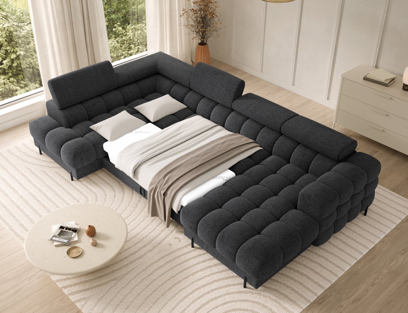 Zahvaljujoč sistemu valovitih vzmeti tipa B in dveh vrst pen – T3030 in profilirani HR3030 – ponuja izjemno udobje tako za sedenje kot tudi za vsakodnevno spanje. Praktična funkcija spanja omogoča hitro preoblikovanje v udobno posteljo, medtem ko prostoren zaboj za shranjevanje posteljnine zagotavlja dodaten prostor za shranjevanje. V celoti oblazinjen hrbet omogoča poljubno postavitev kjerkoli v prostoru brez potrebe po pritiskanju ob steno, kar ponuja veliko prilagodljivost pri notranji ureditvi.