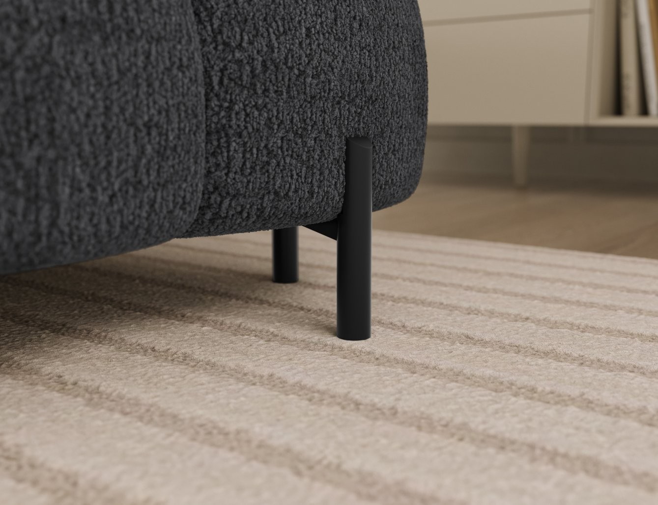Celotna konstrukcija je podprta z močnimi črnimi kovinskimi nogami s prašno lakirano površino, ki poudarjajo sodoben značaj sedežne garniture in dodajajo vizualno lahkotnost. Mehanizem razklopa Dolphin omogoča enostavno uporabo funkcije spanja. Sedežna garnitura Feraria je na voljo v različnih primarnih barvah in orientacijah (leva/desna), kar zagotavlja, da se popolnoma prilega vašemu bivalnemu prostoru.