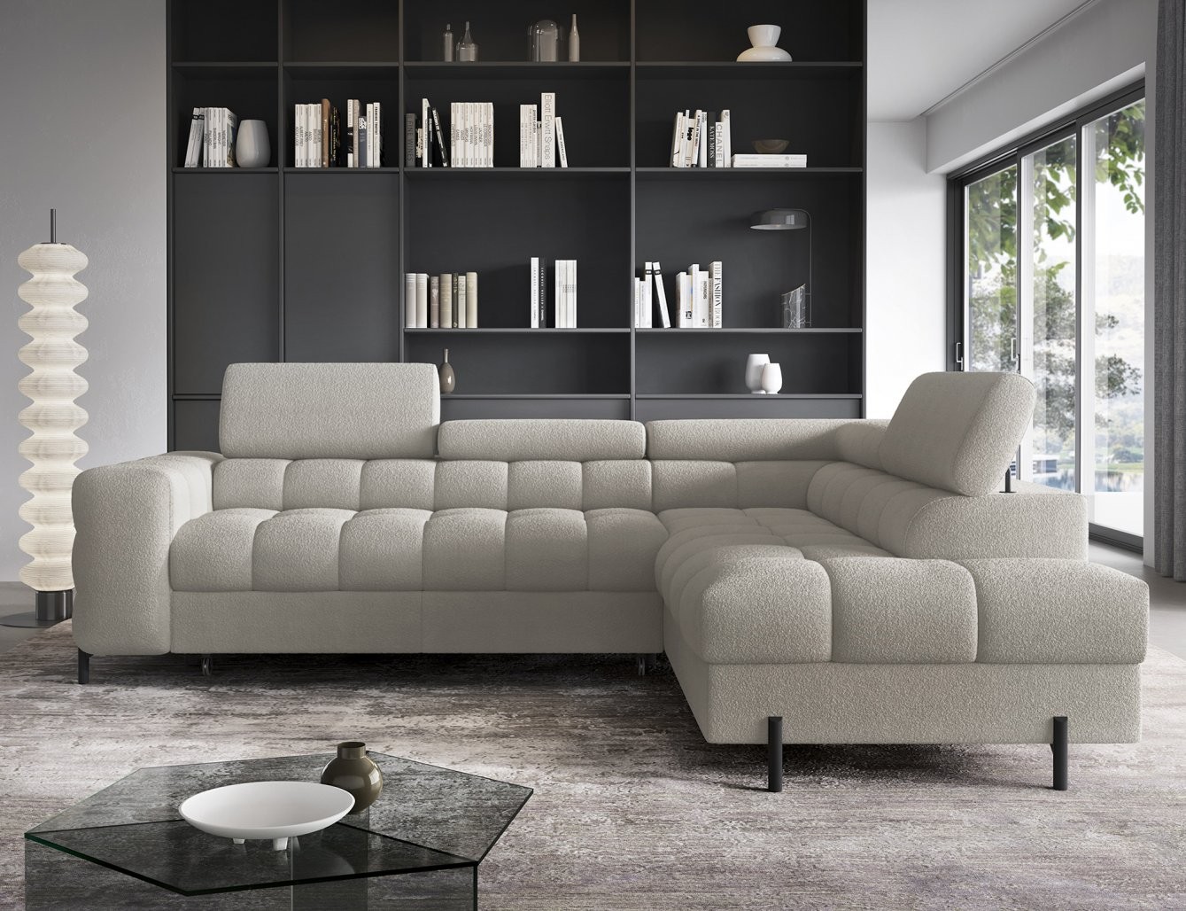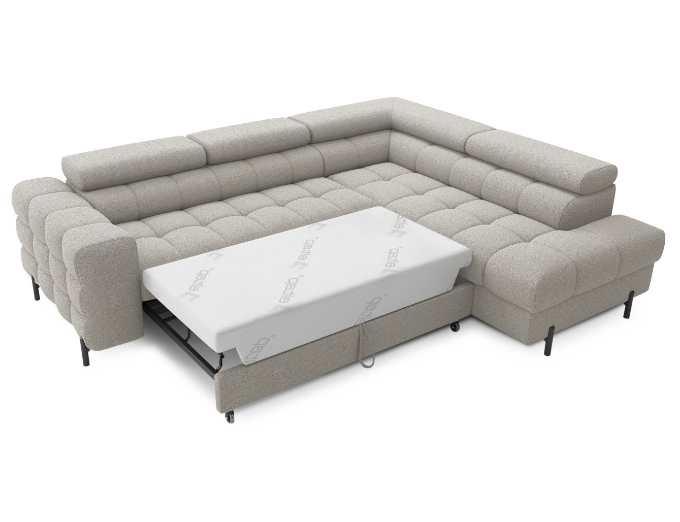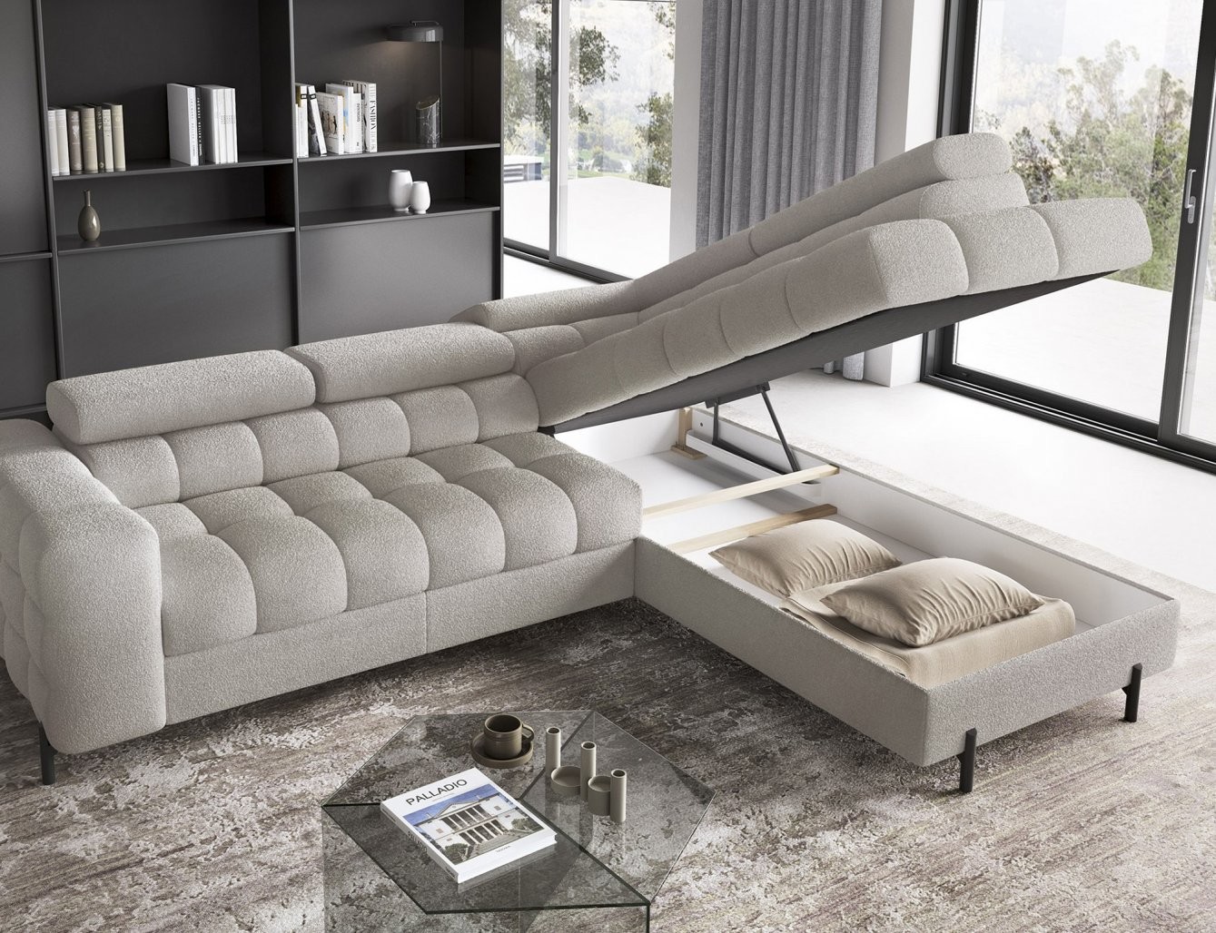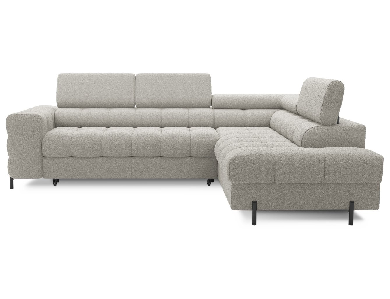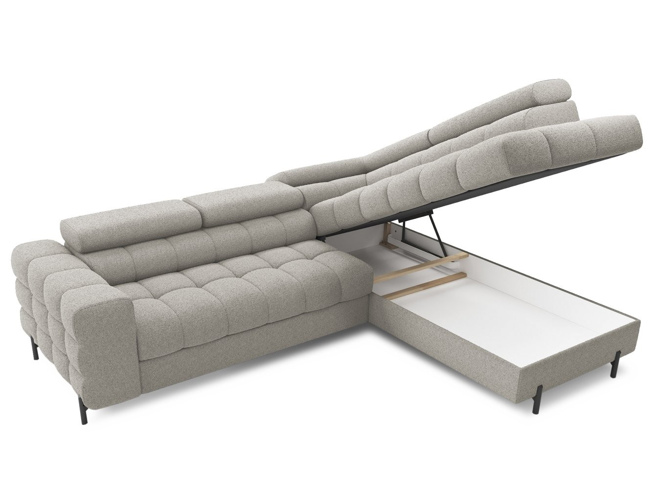 Poleg udobja ta sedežna garnitura ponuja tudi praktične rešitve za shranjevanje in funkcijo raztegljivega ležišča. Z mehanizmom Dolphin se preprosto in hitro spremeni v udobno ležišče, idealno za nepričakovane goste. Vgrajen prostor za shranjevanje pa vam omogoča, da pospravite odeje ali druge predmete, s čimer ohranjate urejenost vašega bivalnega prostora.