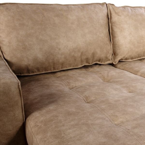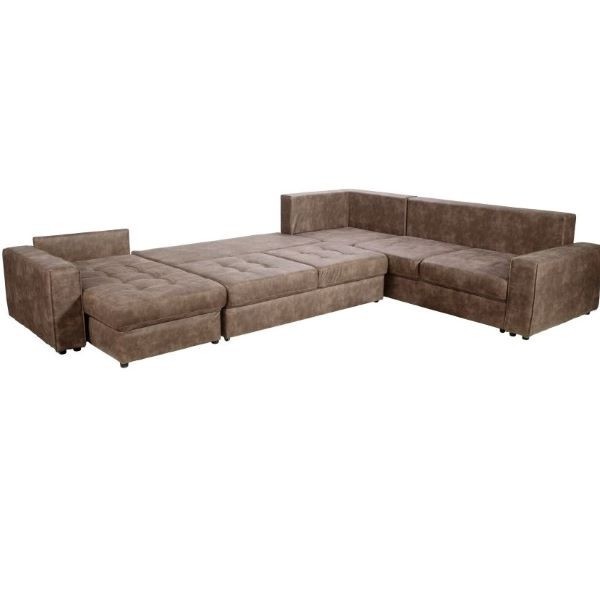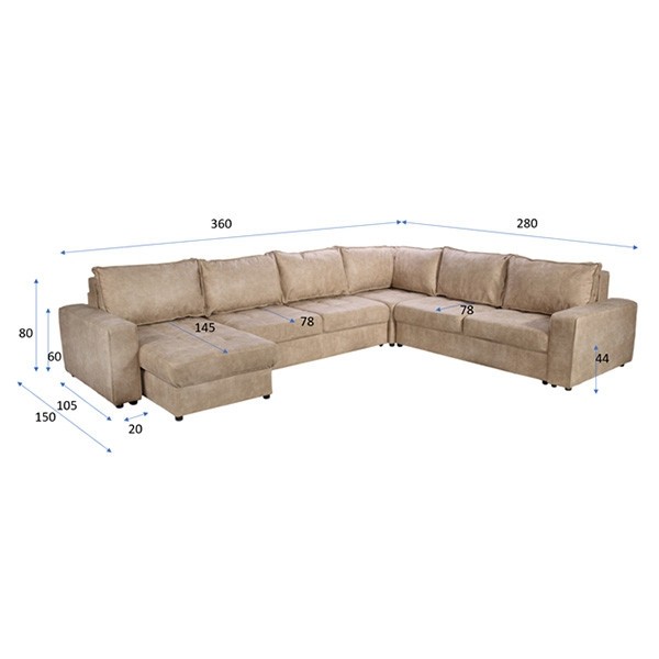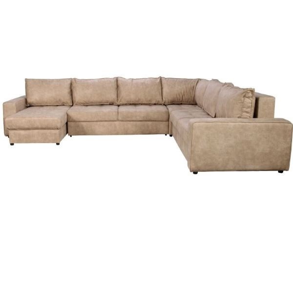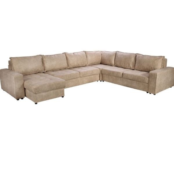 Sedežna garnitura KEN je moderna sedežna garnitura v obliki črke U in z univerzalno postavitvijo, iz visokokakovostne tkanine v svetlo rjavi ali temno rjavi barvi, ki bo dolgo časa ostala lepo ohranjena in je prijetna za sedenje v vseh letnih časih. Sedežna nudi ogromno prostora za sproščanje vas in vaših najbližjih.