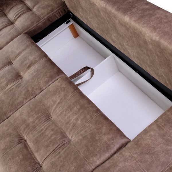 Osrednje sedišče sedežne garniture se raztegne v veliko ležišče dimenzij 320x155 cm, ki nudi več kot dovolj prostora za počitek vaših gostov. Sedežna garnitura vsebuje tudi priročen predal v katerega lahko pospravite posteljnino ter dodatne vzglavnike in odeje za goste.