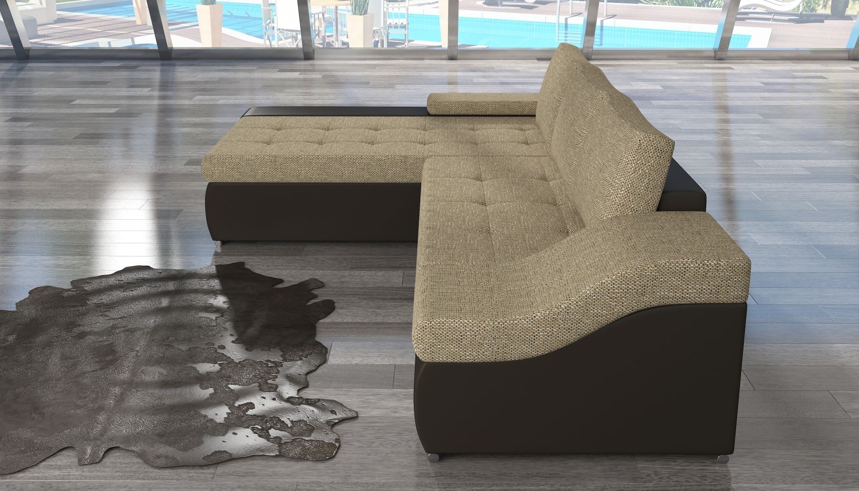 Moderna sedežna garnitura ONTARIO vam nudi vse kar potrebujete za stilsko dovršeno in funkcionalno dnevno sobo. Na voljo je v kombinaciji udobne tkanine in elegantnega umetnega usnja, ki ustvari bolj moderen videz sedežne garniture. Ima ležišče in predal za shranjevanje, ki vam nudi obilo prostora za shranjevanje vseh malenkosti, s katerimi ne želite prenatrpati garderobnih omar.